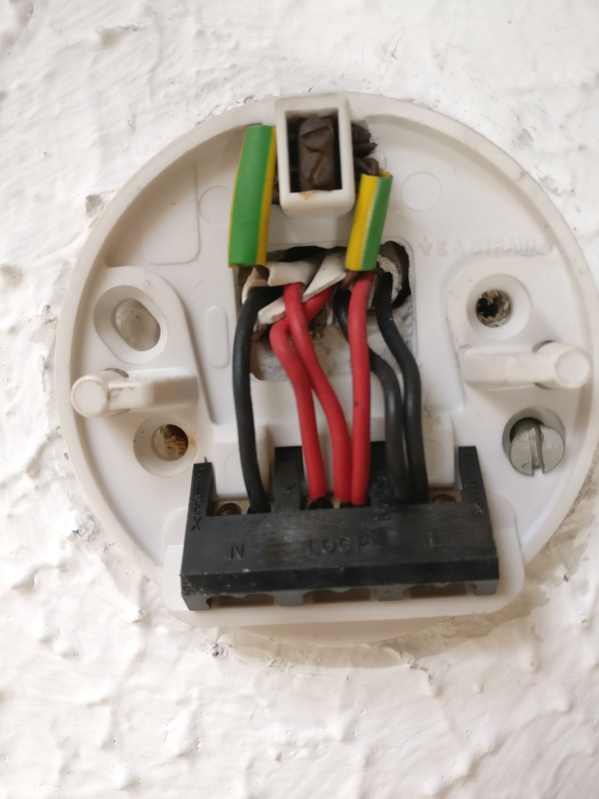So I've attached two images, one of the old ceiling rose currently fitted to the ceiling and the other is the base of the new light. Firstly, before doing anything I'm turning off all power directly at the CU and using a tester screwdriver to check the power is off. As per the picture of the ceiling rose, the labelling for neutral and line on the terminal block is the wrong way round. This is also backed up by the fact the live from the original light pendant was connected to the part marked N on the block and the neutral was connected to L, before I took it off.