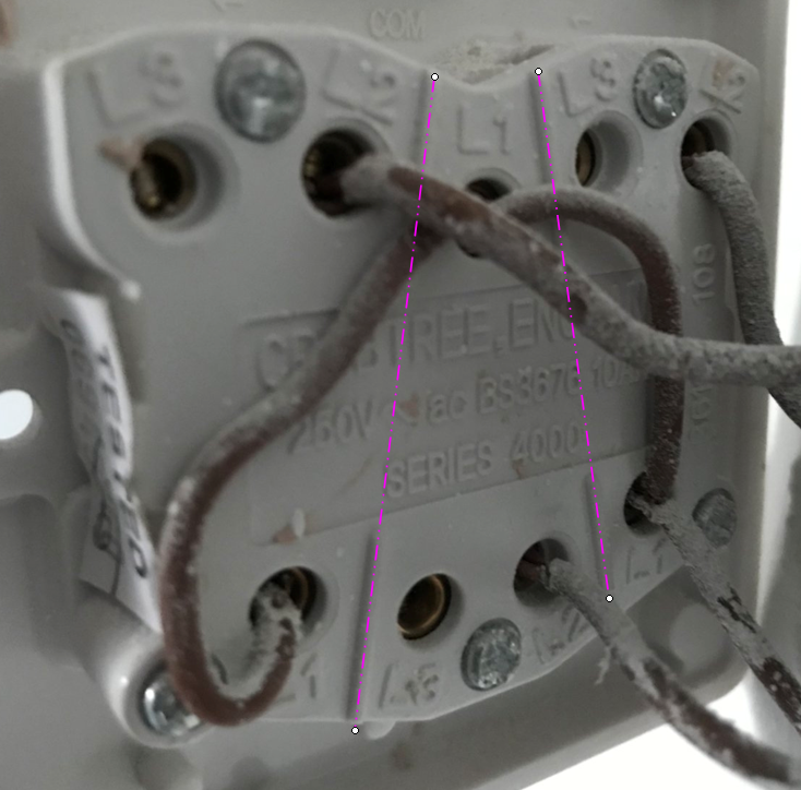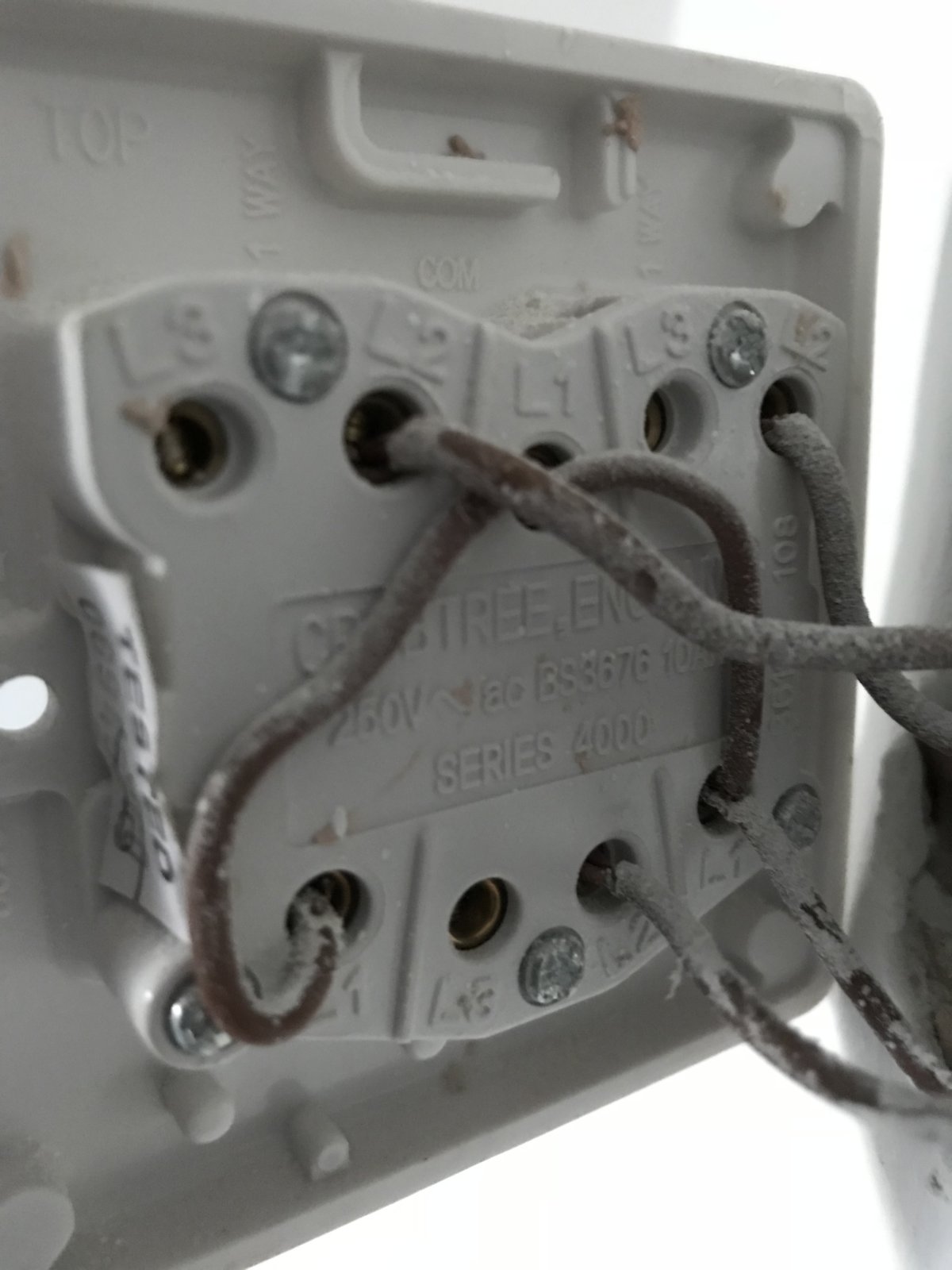 Current switch has 4 brown wires coming in from the wall. 2 are going into L1 and 2 into L2. The L1’s have another brown wire which loops to another L1.