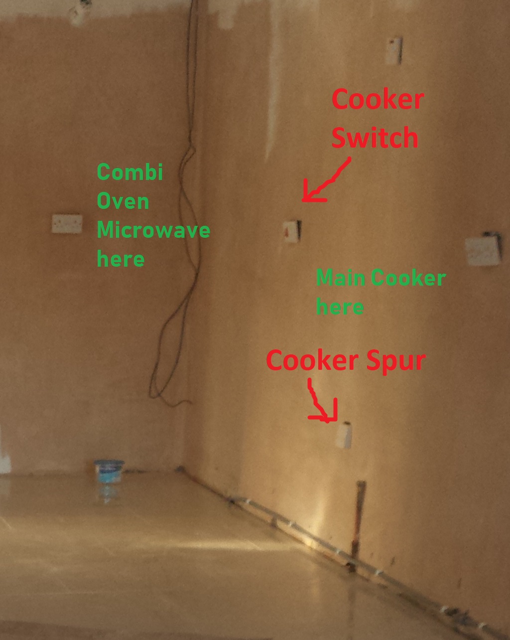 We now require another electric combi oven/microwave/grill (don’t ask!) mounted at eye level around 2 meters away from where the cooker is. This combi unit requires a 16A connection and there is only a 13A double socket in this area.