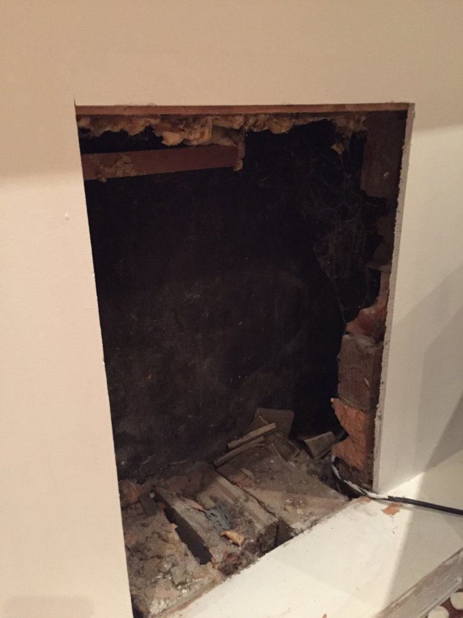 In the dining room, the previous owner has put a wood material (mdf) in the front part and cut out a hole for a basic electric fire to fit in. We want to pull out the mdf and restore the fireplace so it gives the impression of being a working fireplace. The material inside appears to be slate.