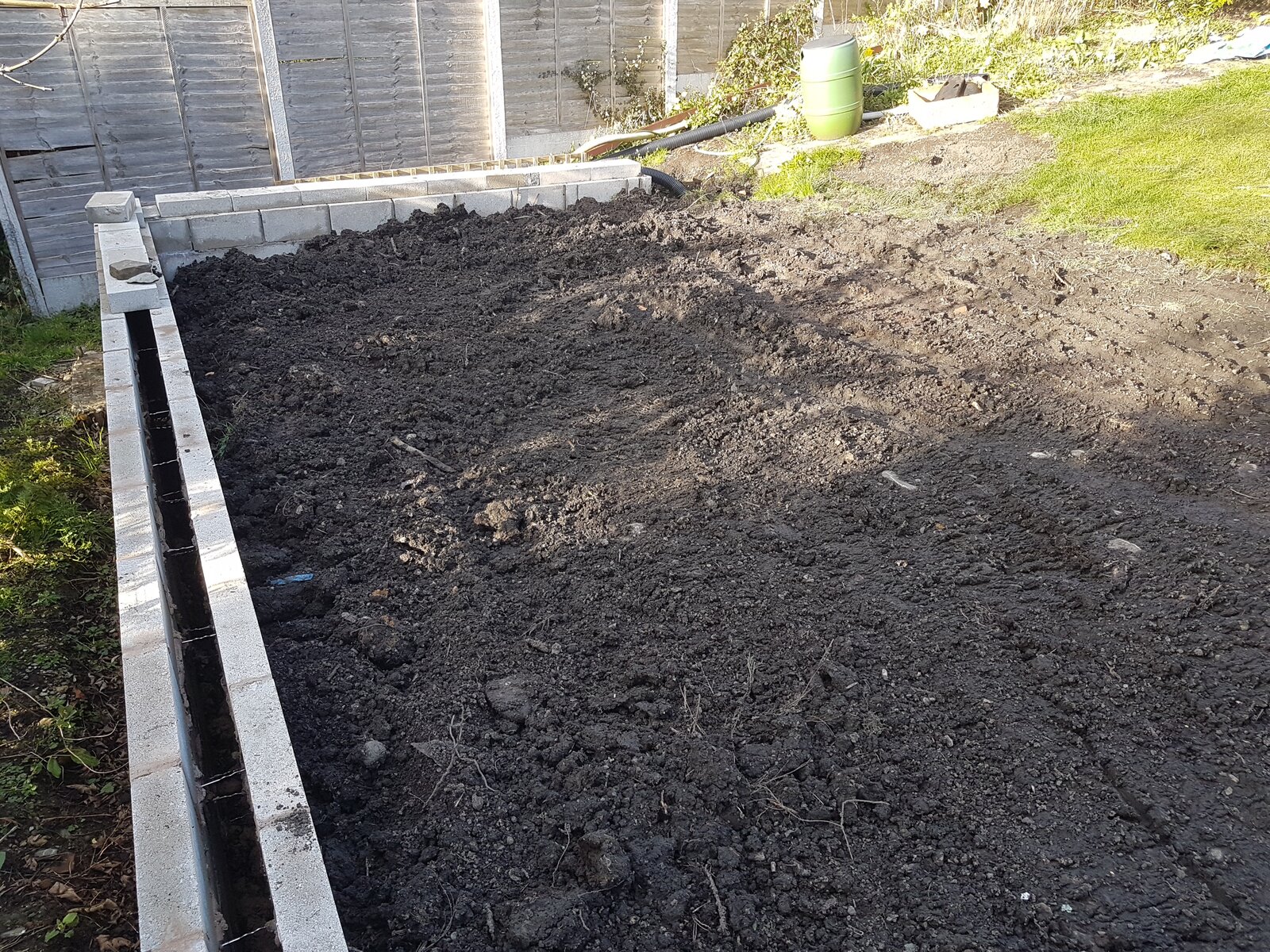 The spoil from the foundations has been levelled off and I've had a builder (he didn't build the wall) explain it needs 40ton of MOT compacted and then concrete inbetween the two skins to reinforce the wall as currently the weight goes all onto one skin. Once this is done then we can add a foot or so of topsoil.