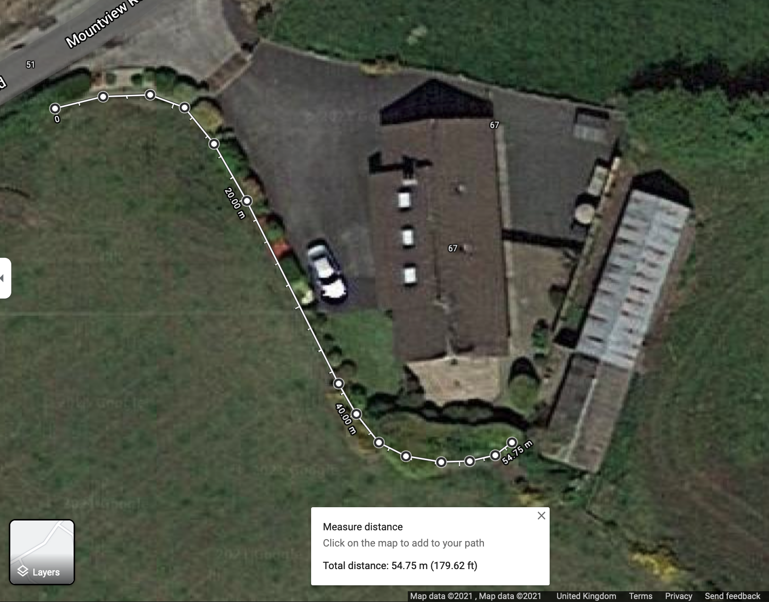 At its closest point, it's about 5-6m from the house. The parts with the lean are around 10m from the house.
