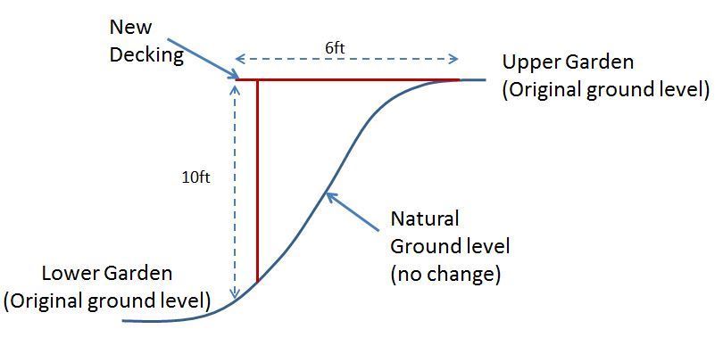 In response to the other question, the end of the new decking that is connected to the upper garden is level with the natural ground level of the upper garden. Therefore yes the decking starts off at natural ground level.