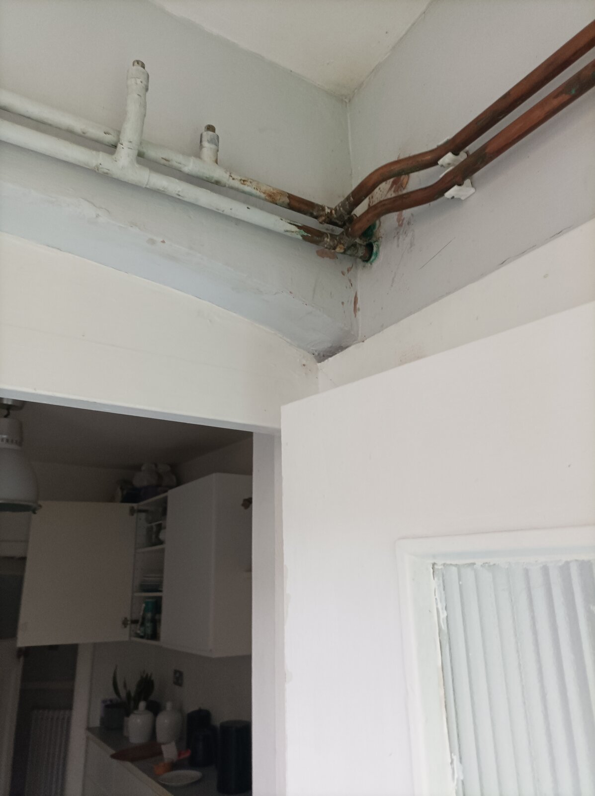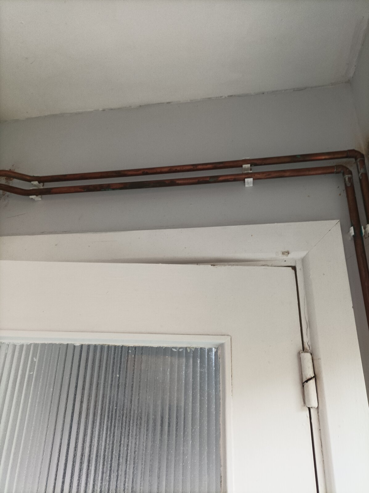The pipe work above the door is at the point the return pipe is cold, all the way to the entry point to the radiator, so the left side is cold and the right hot.