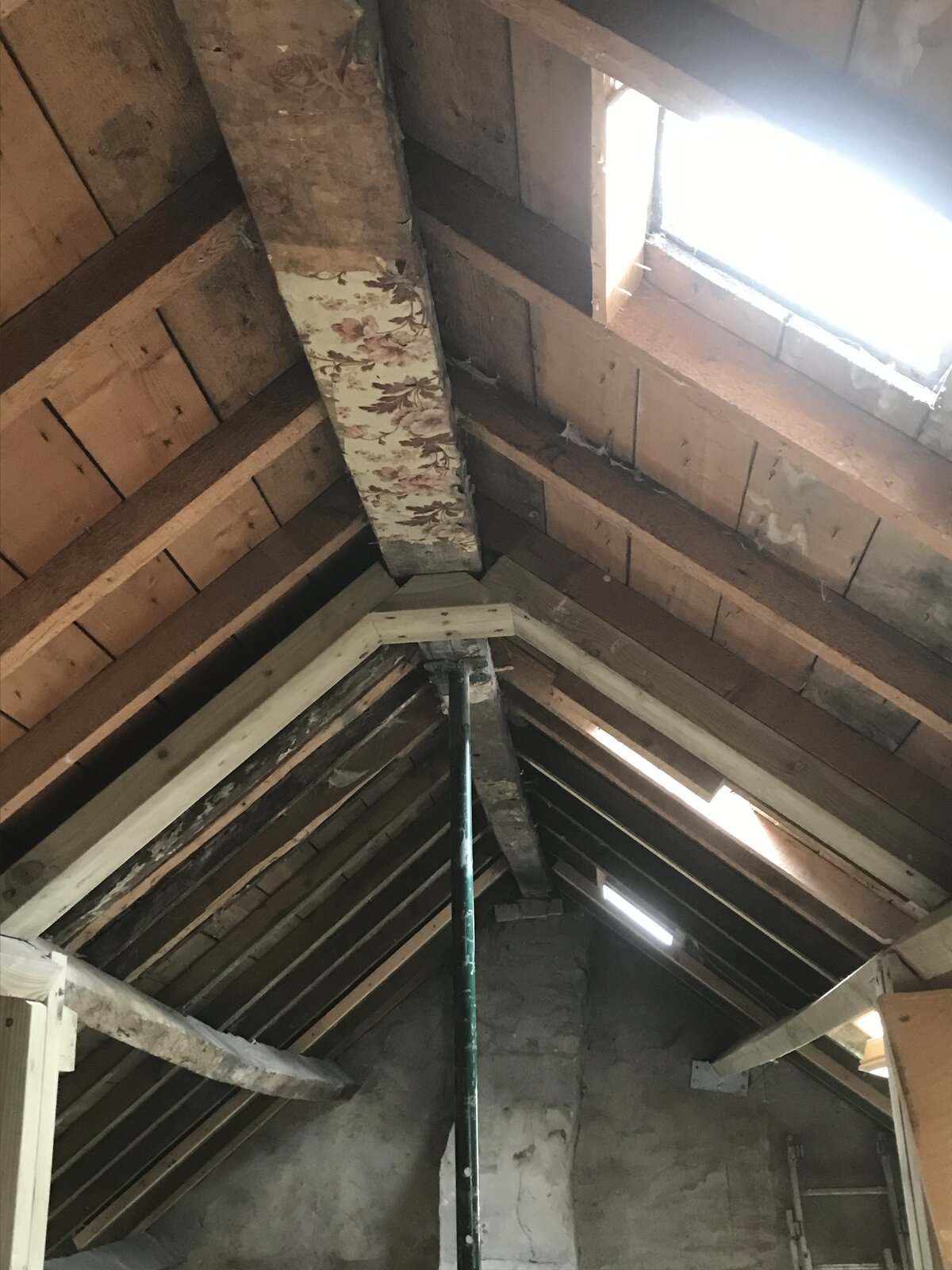 One side of the ridge beam is supported by the 8x3 uprights and I have no worries there , but the other side where I’m having the vaulted ceiling there seems to never have been any support as the original brick wall wasn’t even touching the ridge , there was enough gap for me to get my fingers through.