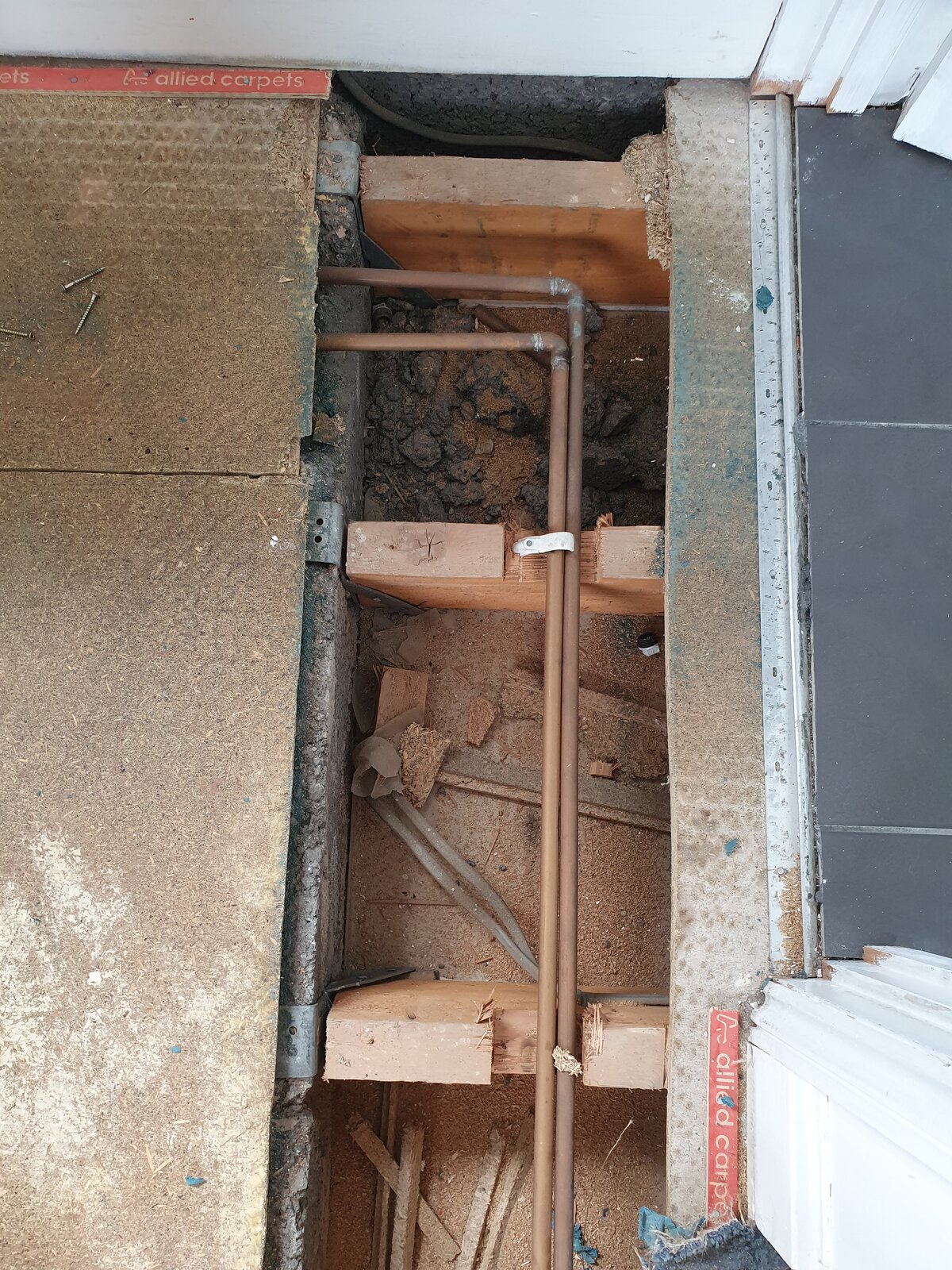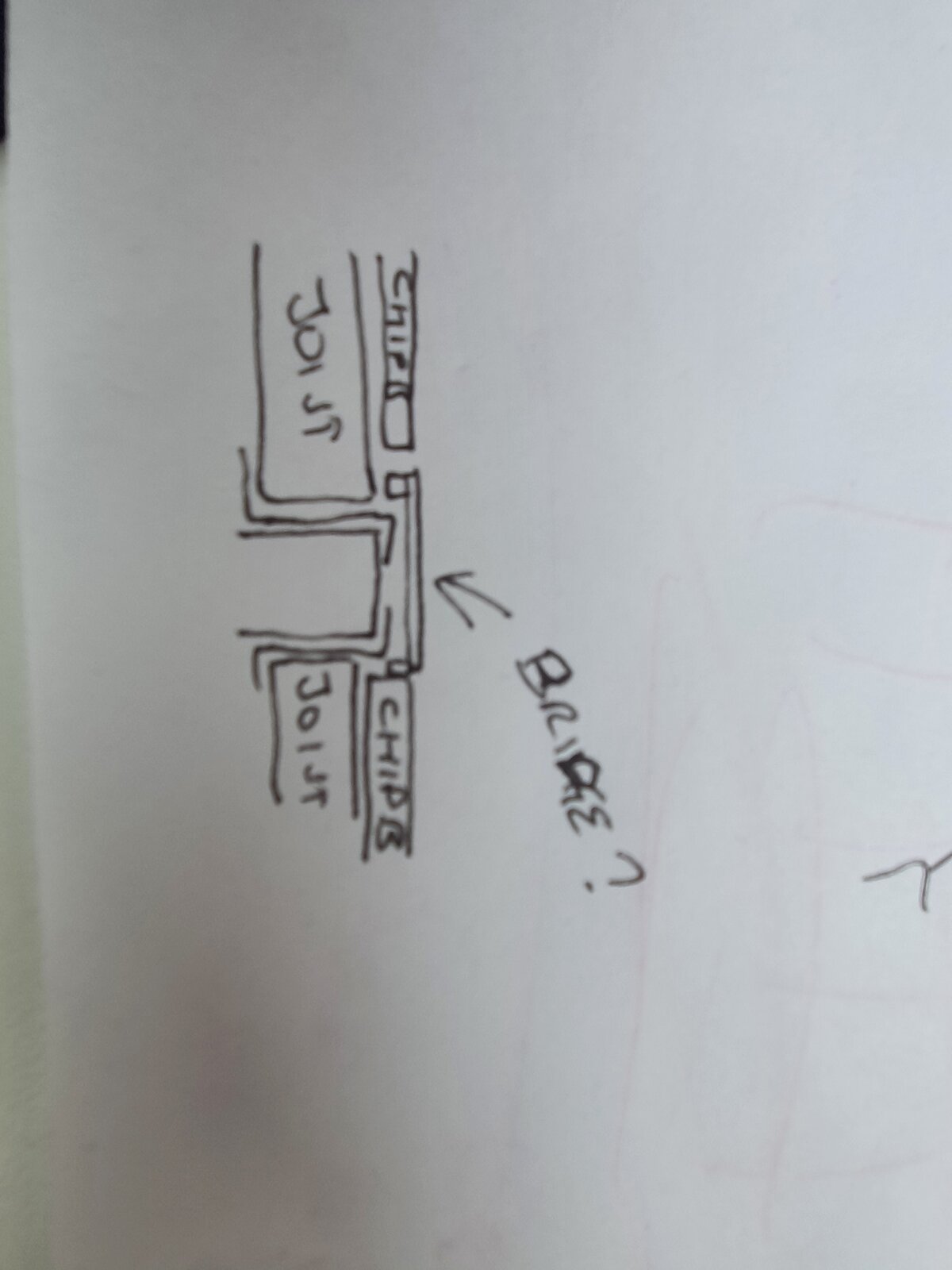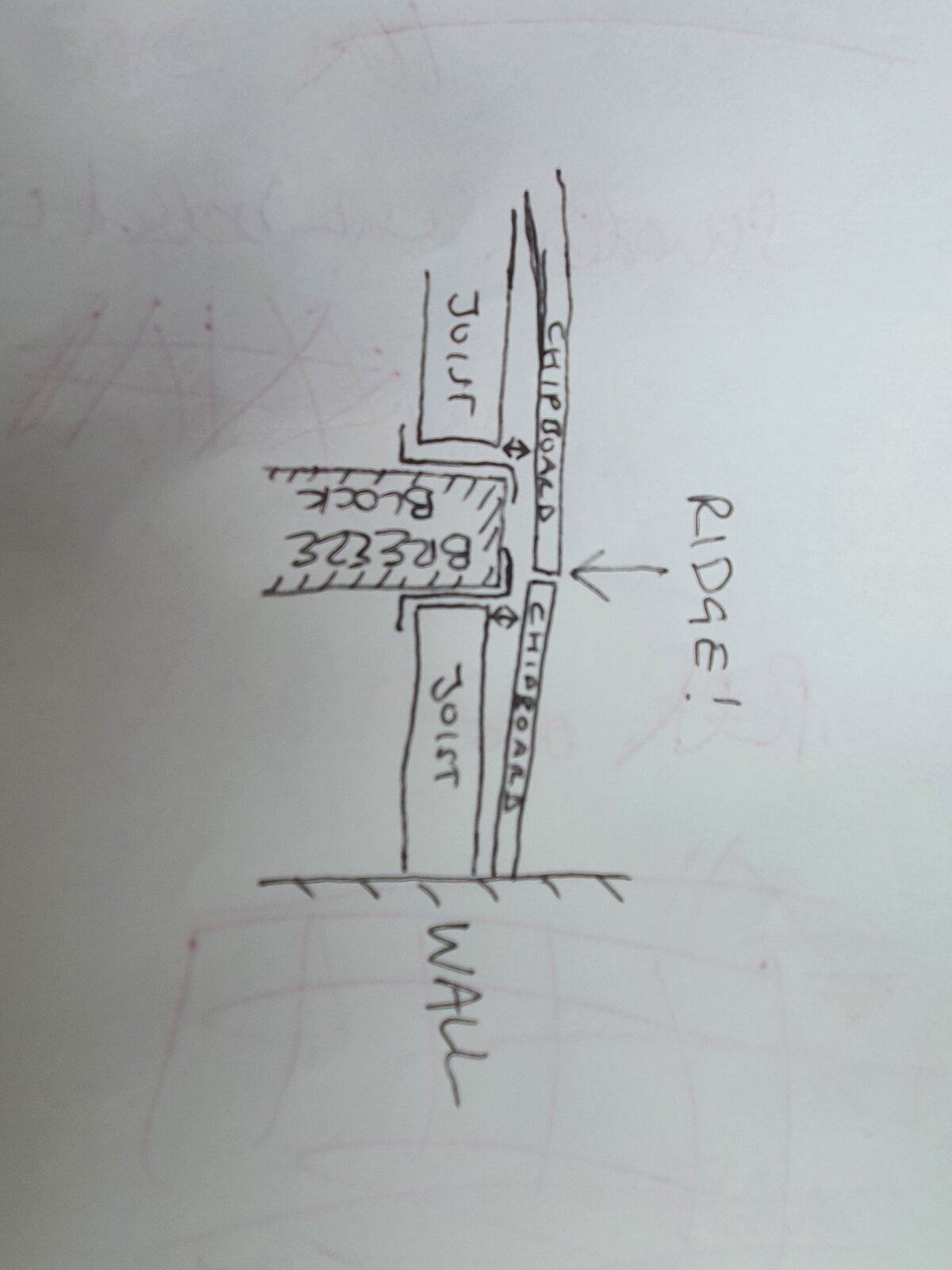 Looking to re carpet one of our bedrooms, which has a pronounced ridge running the length of it, around 2ft from the nearest wall. Seems this is because the breeze block wall of the room below is higher (especially with joist hangers) than the joists that the chipboard rests on either side. Photo and a crude cross-sectional diagram attached.