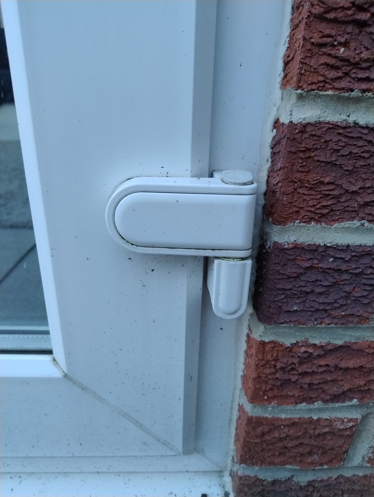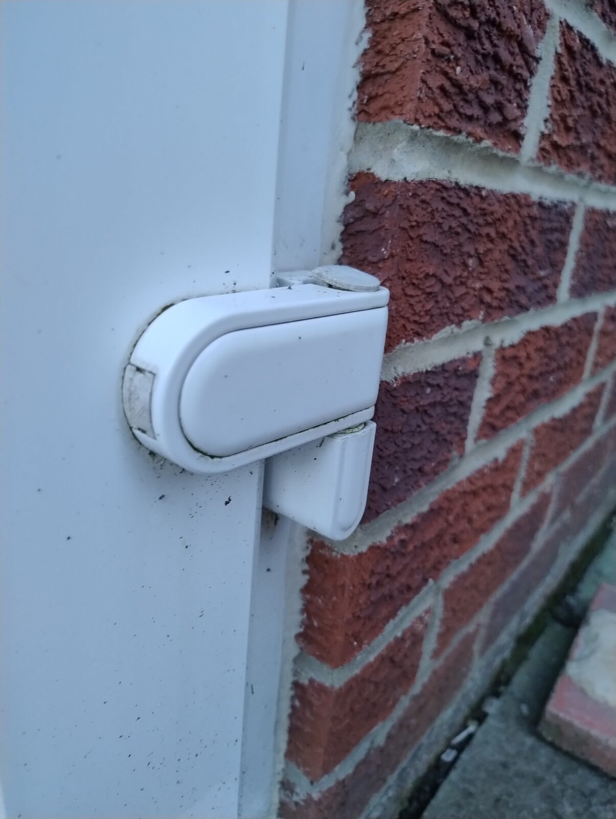 Can anyone advise how I would go about adjusting the hinge on this door to the left? It appears to have slipped over time and the locking mechanisms are no longer catching on the bottom half of the door.