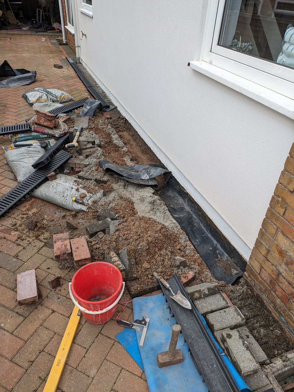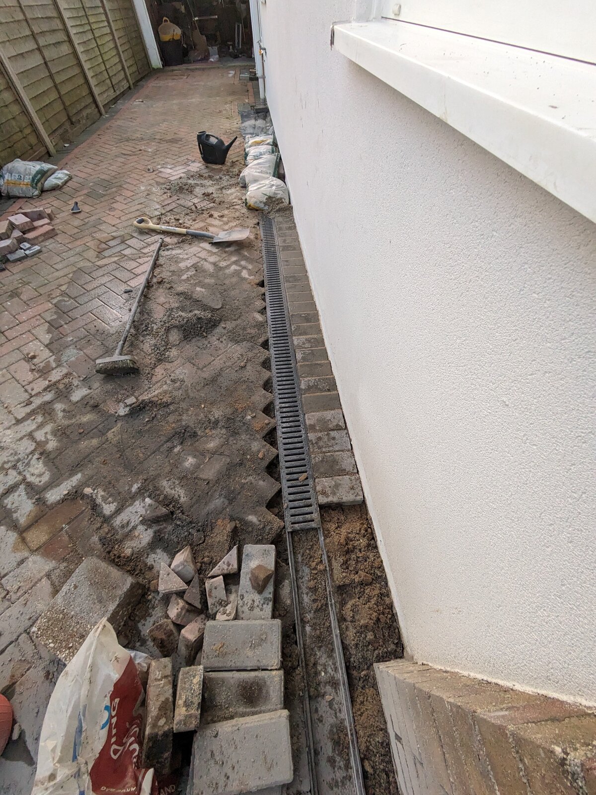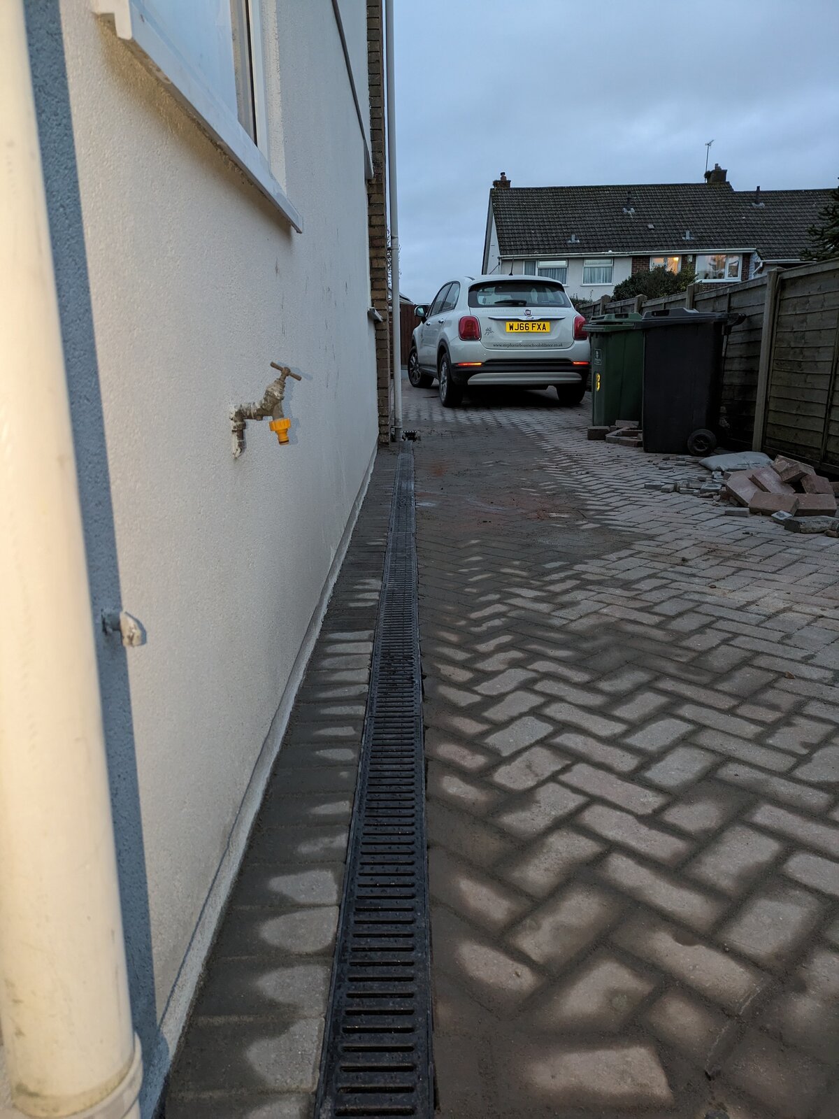 Last week had aco drains put in outside on the black paving. The driveway would not meet new regulations as driveway is so close to the damp course.