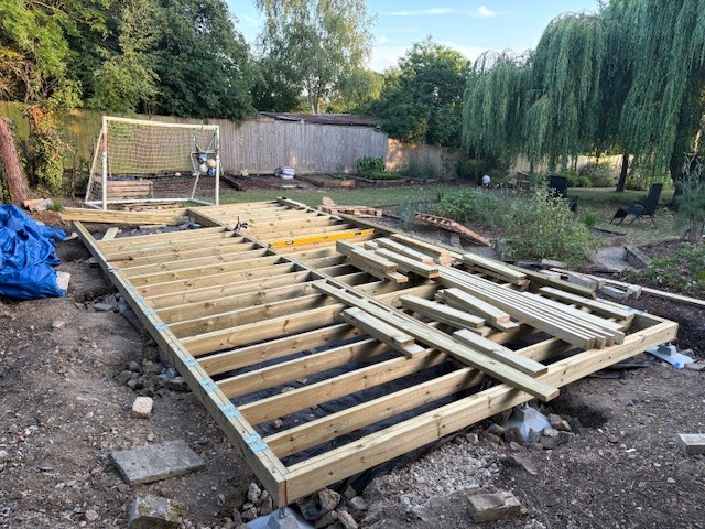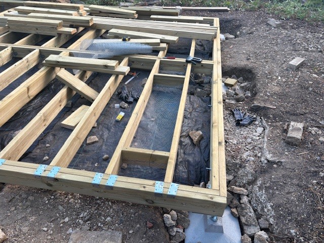 After what has been months and months of groundwork (endless digging, 15 tonne of rubble shifted, tree removed, raised beds made from railway sleepers relocated...), I have finally begun construction of my 8m x 4m garden room. For the foundations, I decided to use EasyPads - I am building on a slight slope and am also ~100 metres away from the road, so this seemed like the best/easiest option. I've almost finished the frame for the timber floor - just a few more joists and then noggins to fit, before I insert PIR insulation. However, before I do that, I am wondering whether I should rodent-proof my floor somehow (we were round at my parents last week, where we discovered that they had a large rat living under their summerhouse!). The void under my timber floor is 10-20cm, so my initial thought was to somehow secure the perimenter of the floor. However, it seemed like there was no simple way of doing this, and I was concerned that any rodent mesh in contact with the ground would rust/break down over time, or creatures could dig under it. I have therefore decided on the more time-consuming and costly option of securing the lower section of each of the openings in my floor with rodent mesh (meaning that below each piece of PIR insulation there will be mesh). I've used 6 x 2 timbers for my floor and plan to use 100mm insulation, so I have a little bit of room to play with under the insulation boards.