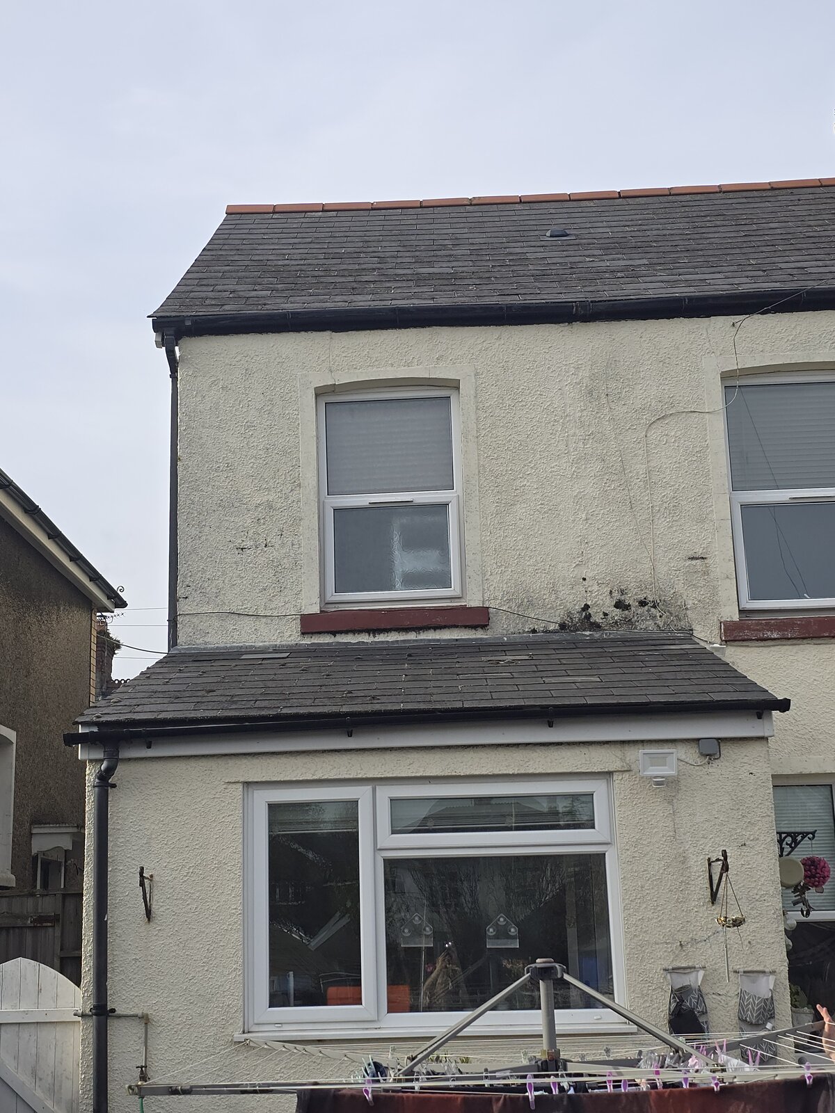 Kitchen Roof in picture is 3.5m wide. Some years ago some local guy was doing work on it and he apparently used ladders across it to fix gutter I think (my elderly mothers house) hench the broken slates. Also I think there is damp like marks on the render as gutter is leaking.