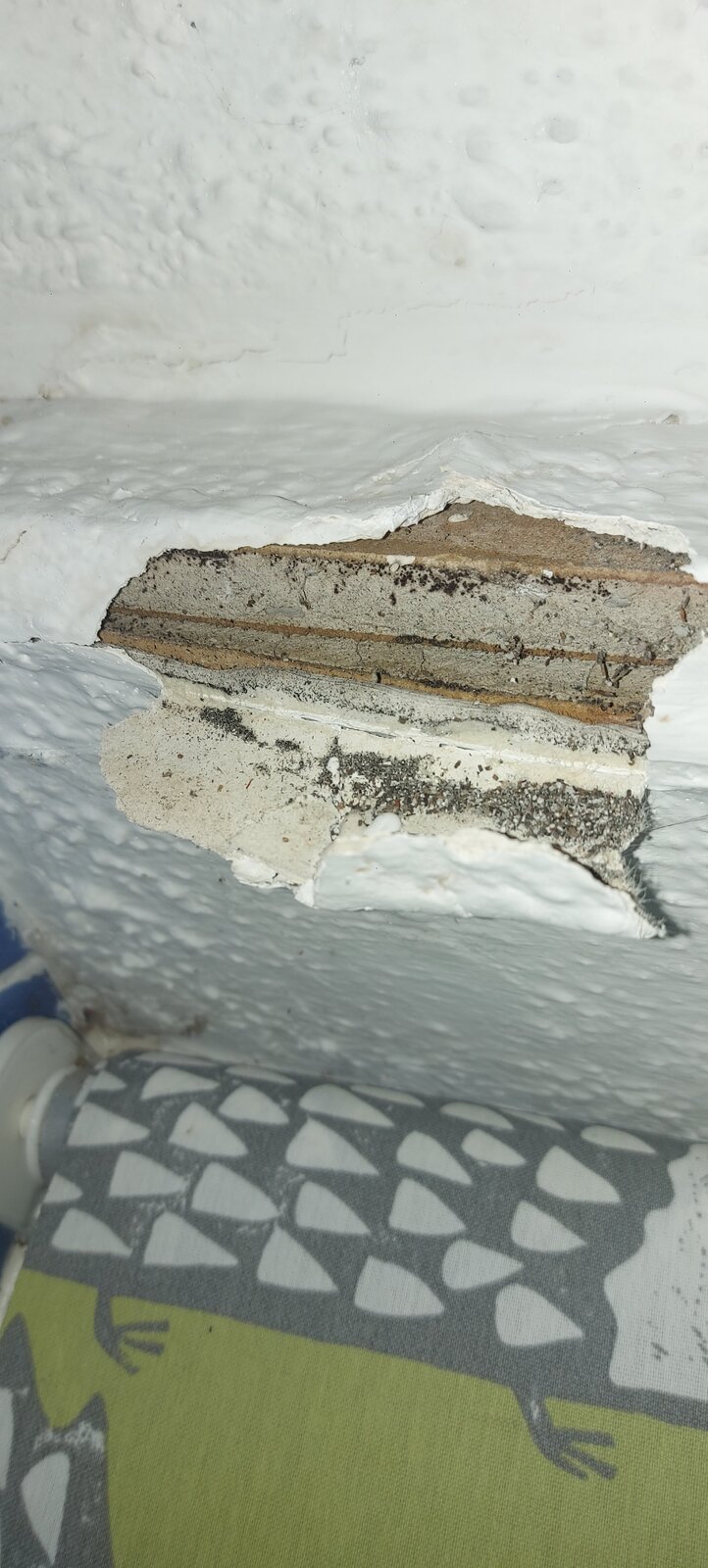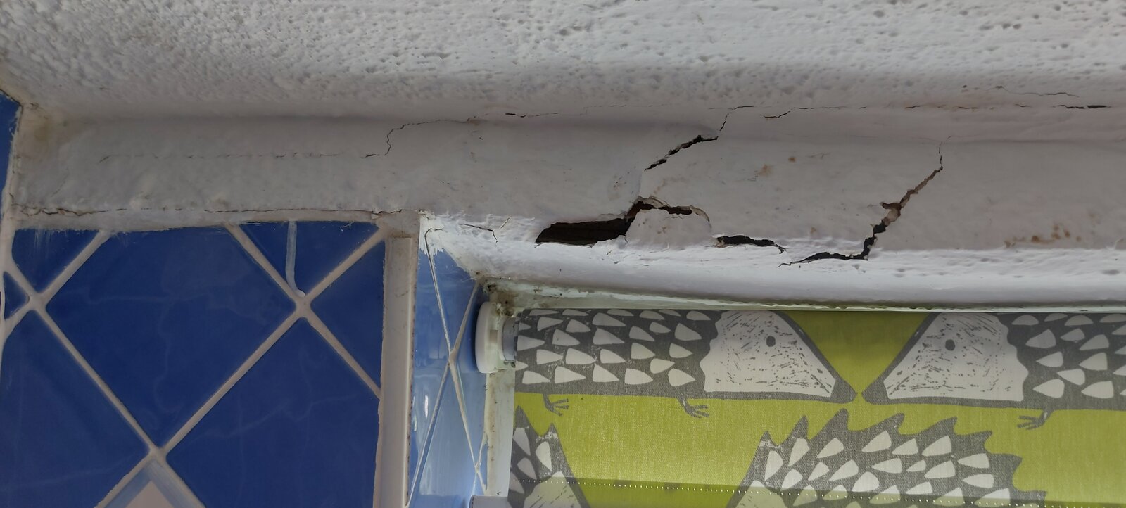 The scaffolders were big and heavy footed working on a Sunday, we heard a lot of banging and noises that worried us. The scaffolding has been up for around 2 weeks now and these are my concerns: the kitchen cupboard directly under a beam gets jammed for the first time, you can see the wood of the cupboard bowing, cracks in the dated artexed ceiling appearing, the blind over the main window rubbing against the plasterboard above, the beam has come away in places...... From the outside you can see the roof dipping in the middle.
