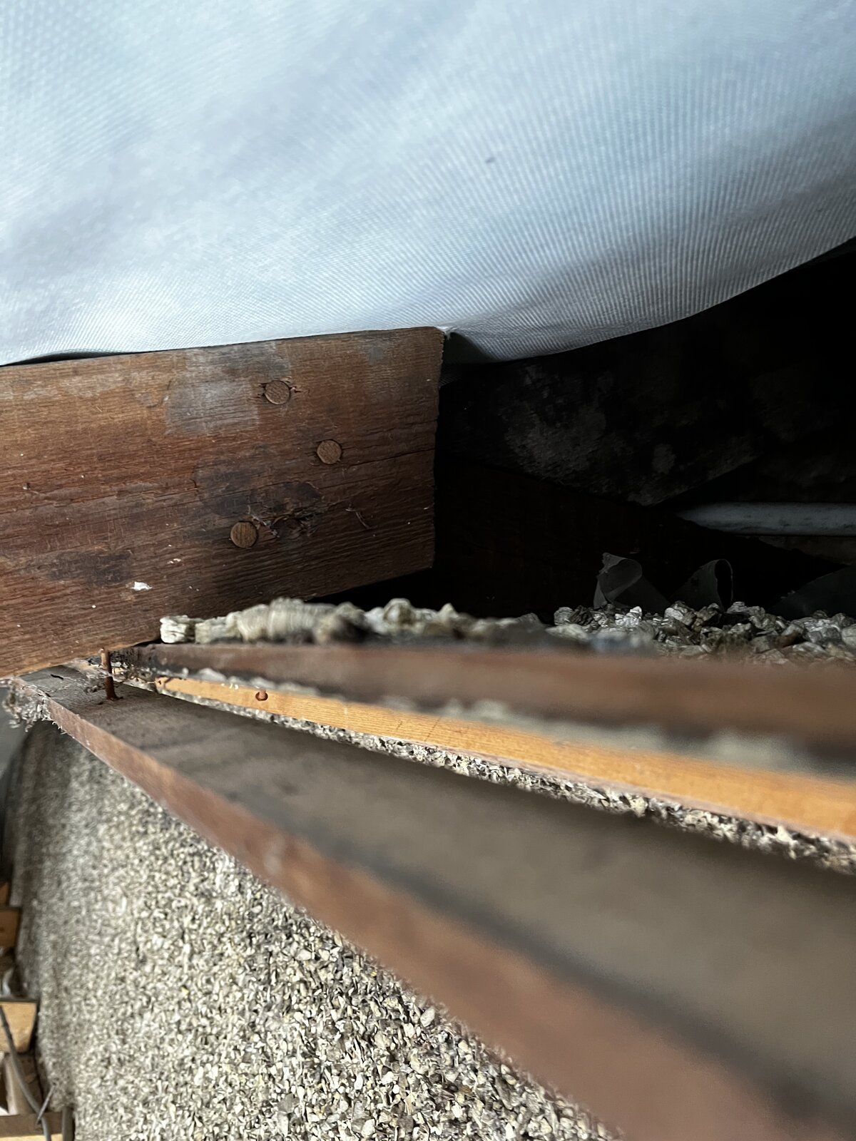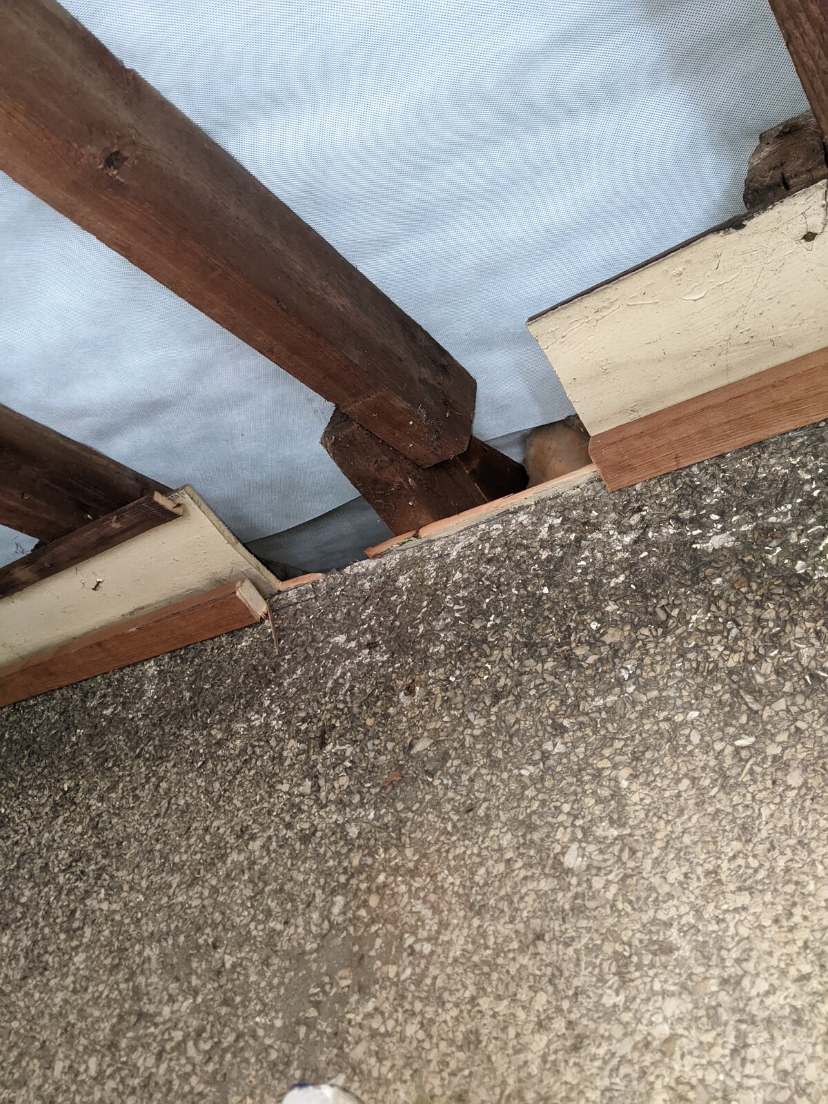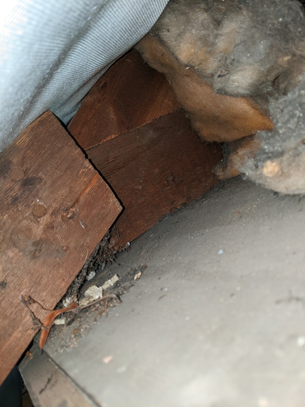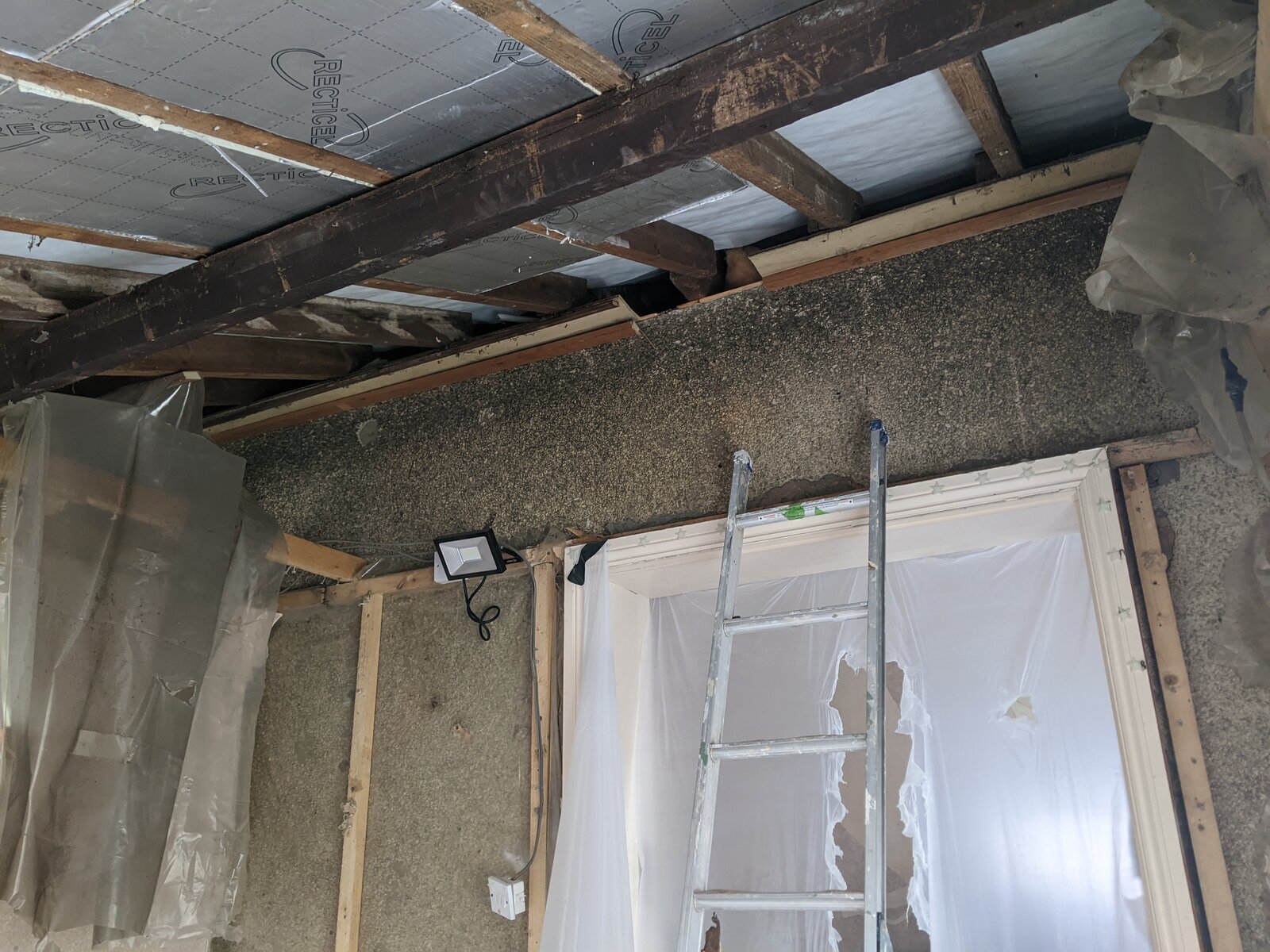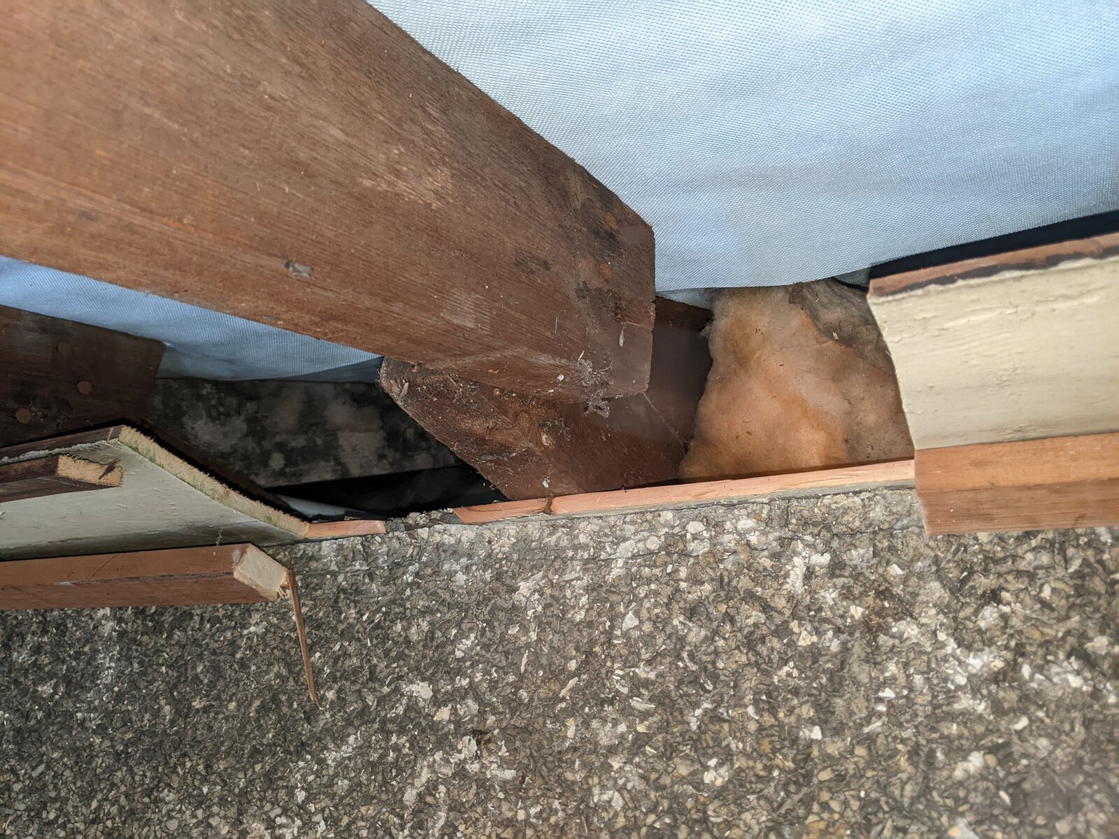 Originally there was a lean-to roof that would have been attached to the outside wall with joist supports. At some point, someone has extended upstairs and used the same roof joists which now tie into the main roof of the house.