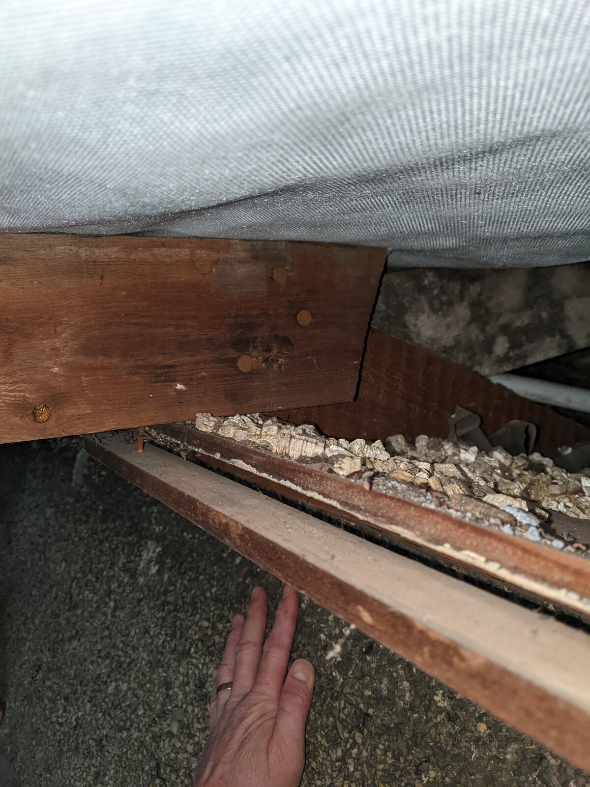 The concern I have is that where previously each of the joists would have had their own joist support attached to the wall, now the end of each joist is simply nailed to the end of the main roof joists. As the joists from the extension aren't long enough to actually sit on top of the wall of the house themselves, the only thing taking the weight on the top side is the two nails on each joist tying them into the main roof joists.