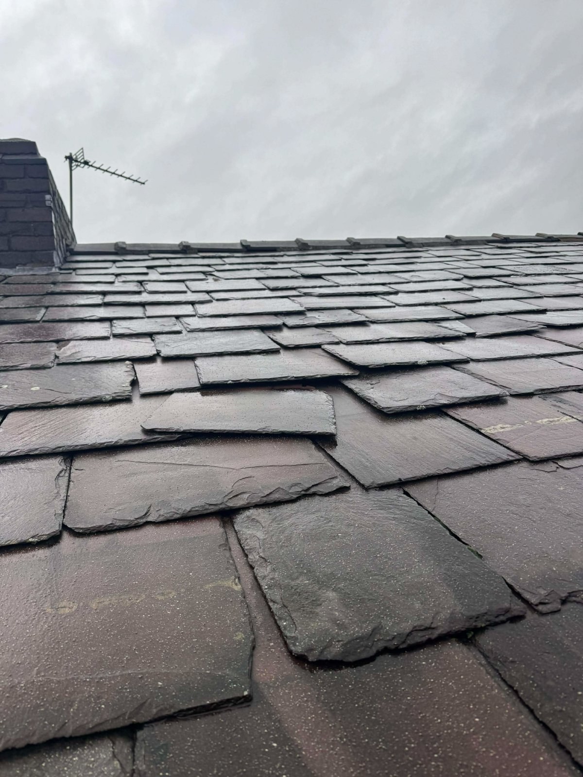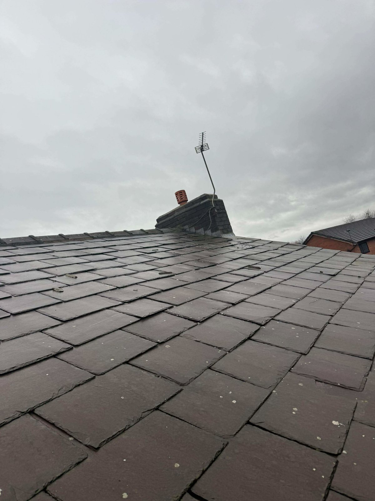 We have a few loose and damaged slates and some tired pointing on the ridge tiles so I asked a reputable local roofer to take a look. Quote was to;