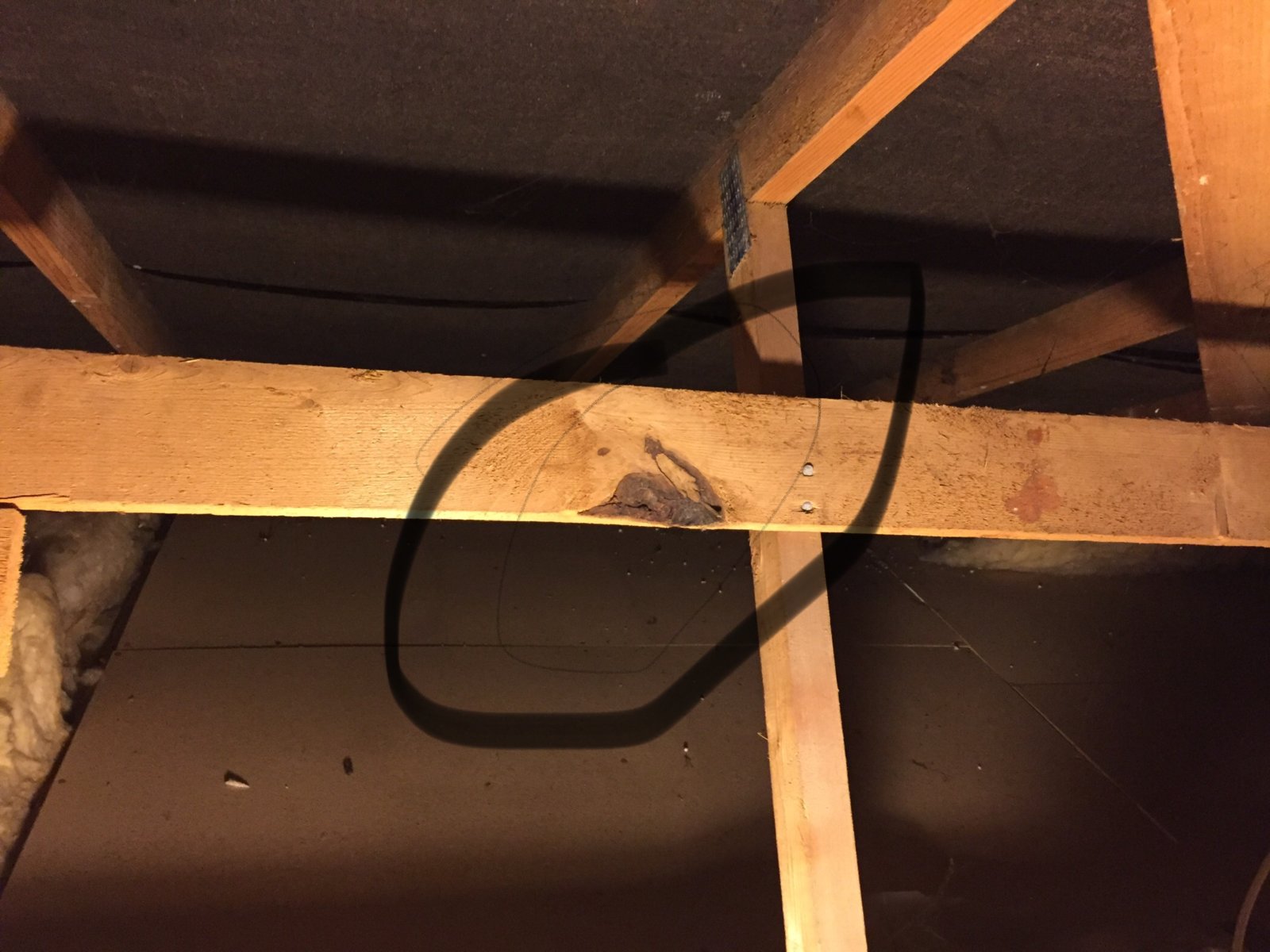 While I was in the loft, I found one of the timbers has a black mark as shown in the photo. On touching it is very dry and hard. Is it some sort of natural defect of the wood,not rot?!