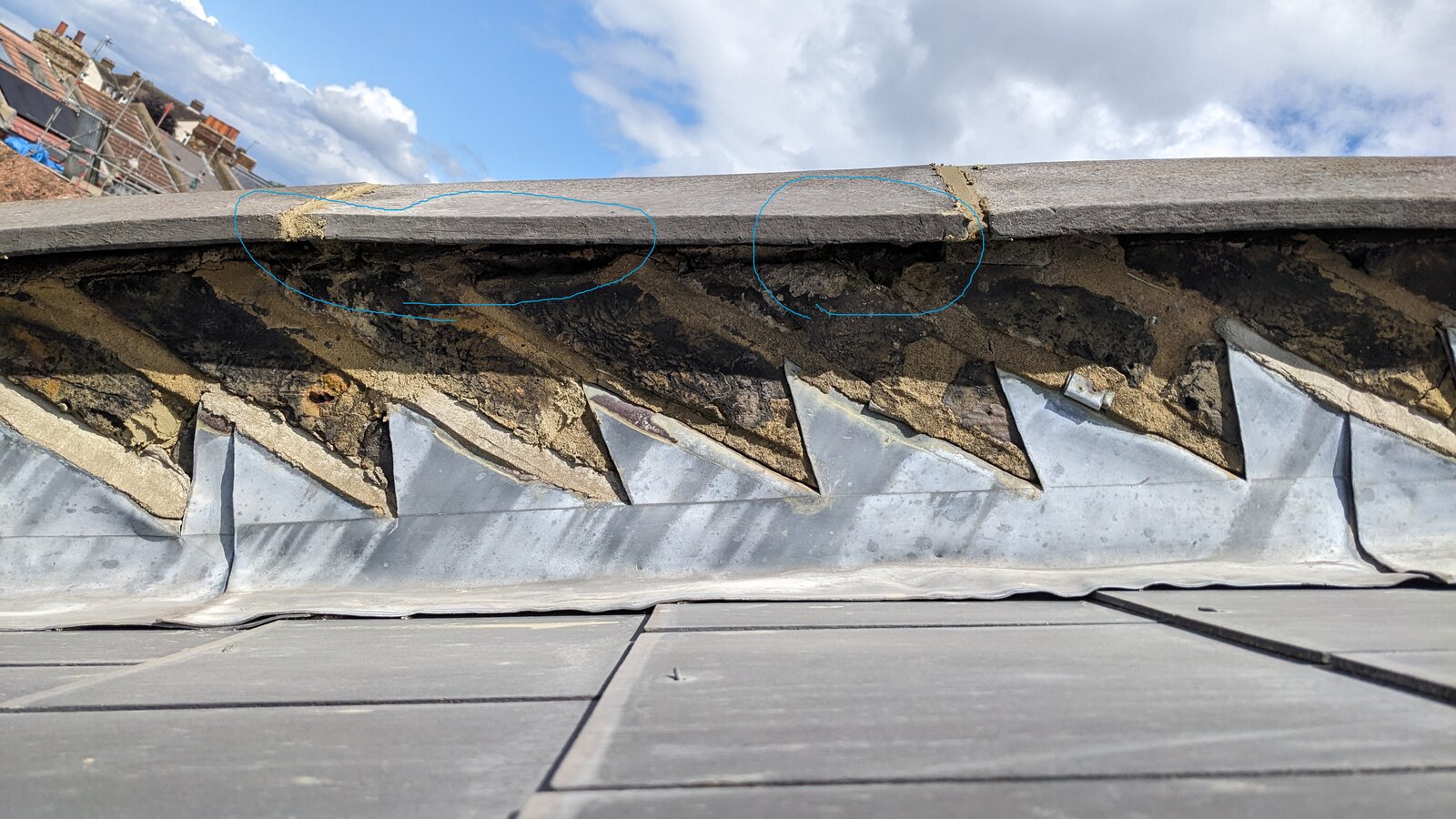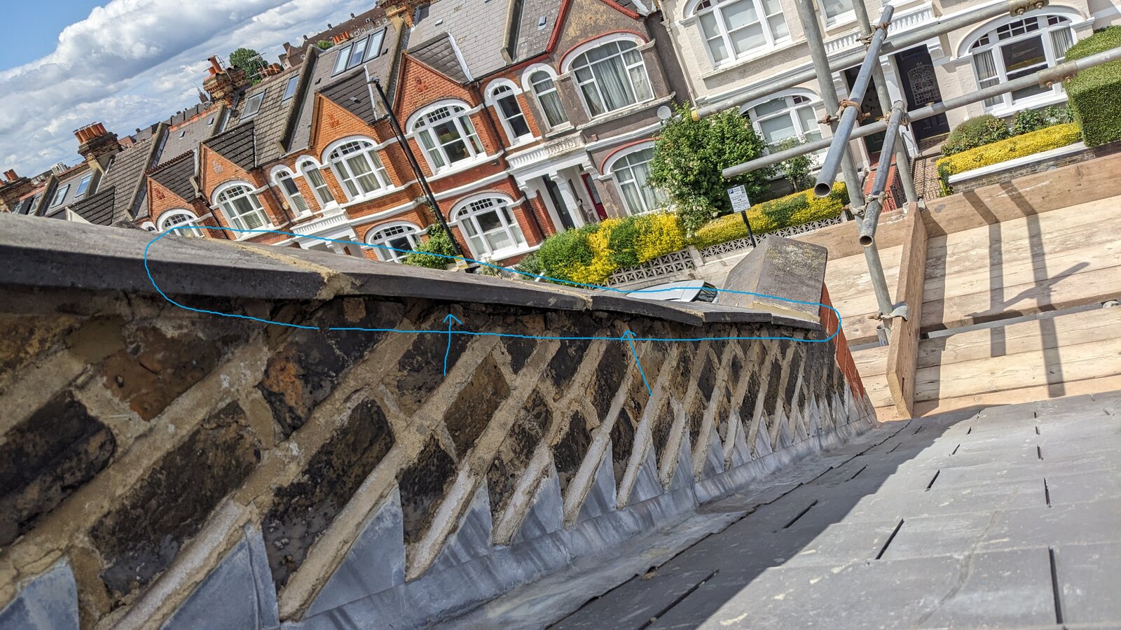 Had the roofer have a look at chimney stack for a leak, re-bed parapet capstones (some were proper loose!) and point in places the parapet sides.