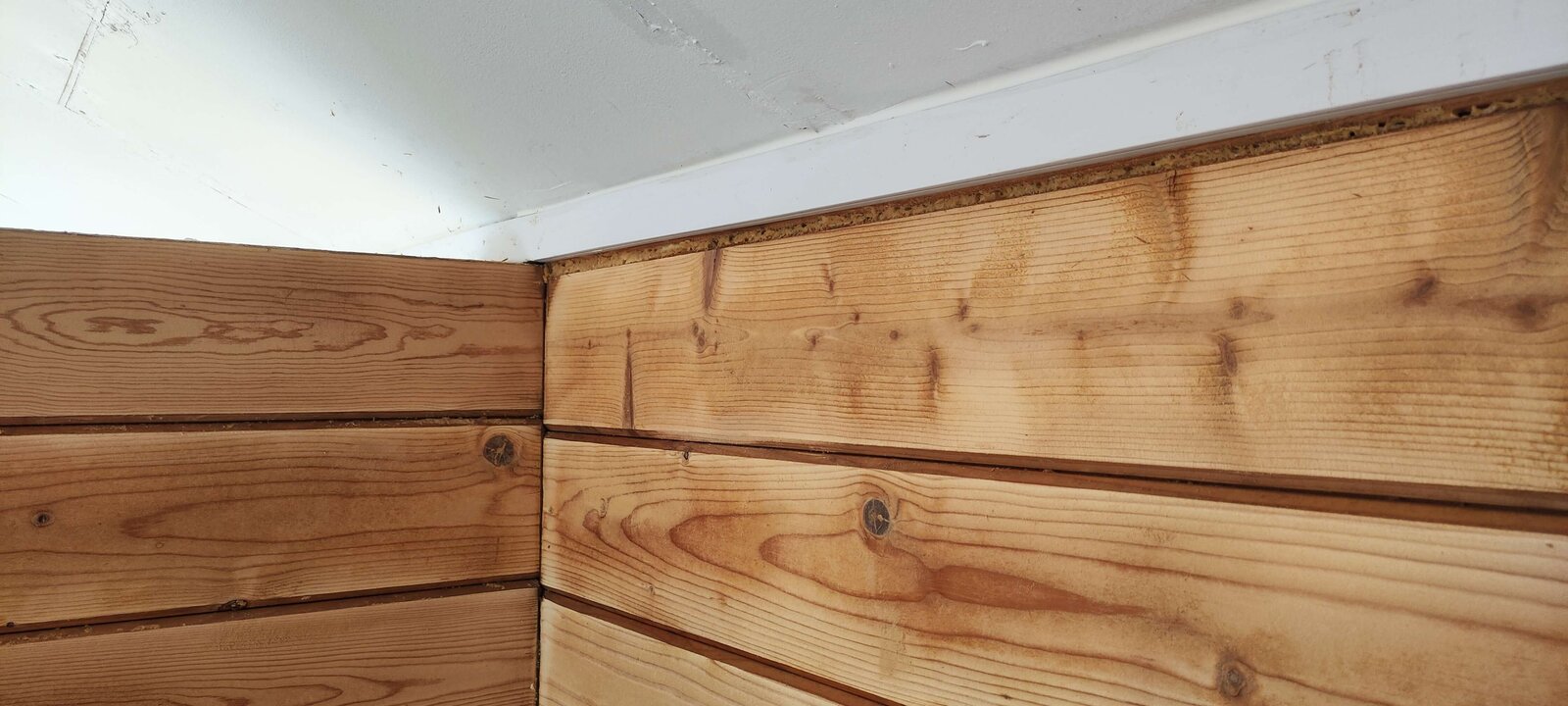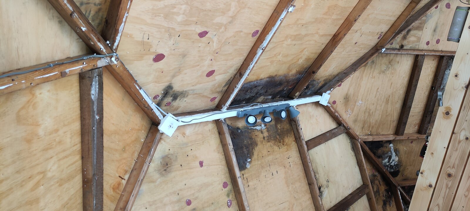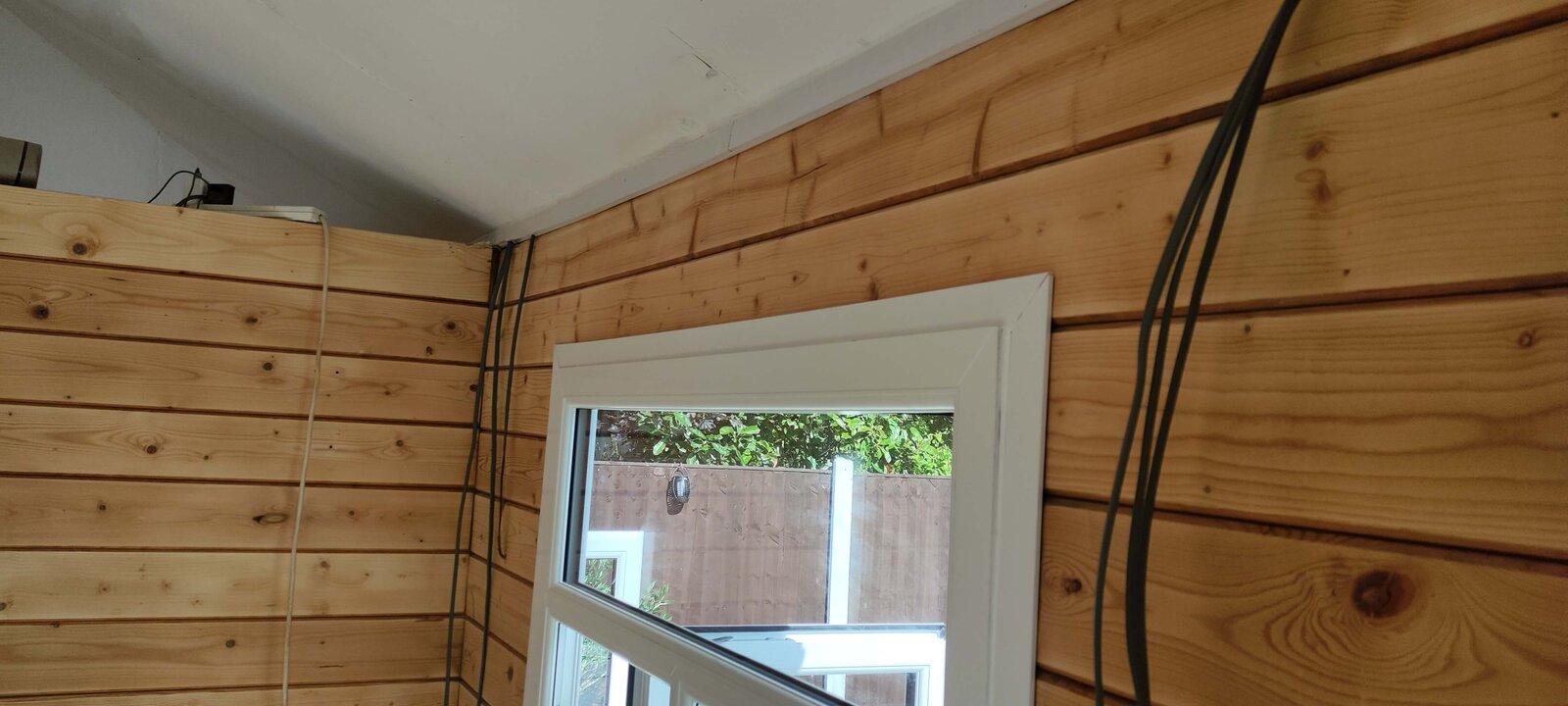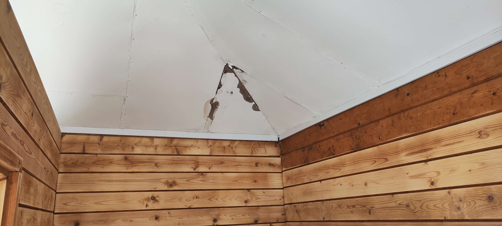 Today, I also pulled down 3 pieces of the inside hardboard on the ceiling. I painted it yesterday and this morning there were evident signs that it leaked overnight as the hardboard was stained. And one final note, in each place I pulled the hardboard off there were signs of black mold on the wooden roof backing, quite a bit in fact and that worries me. They've a child who is nearly 2 and in and out of the summer house..