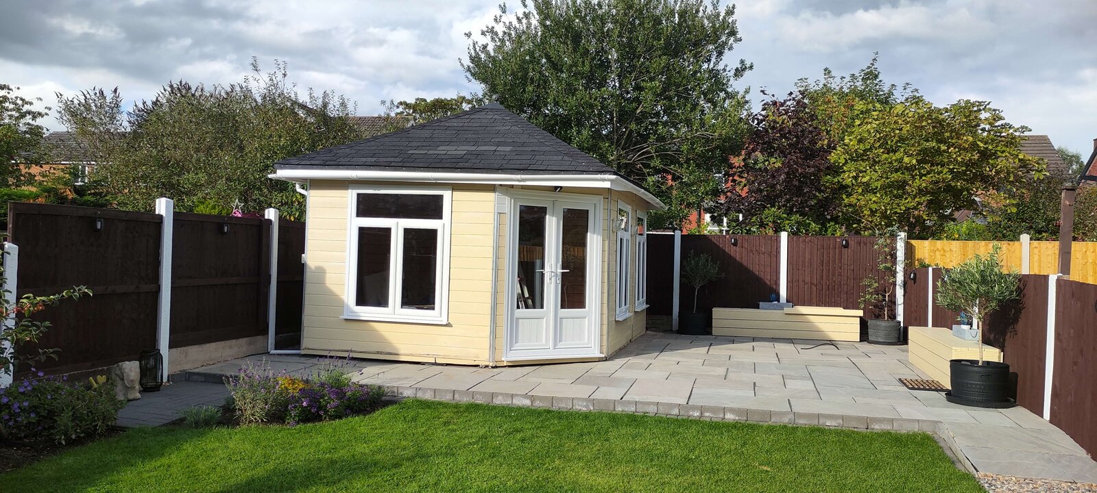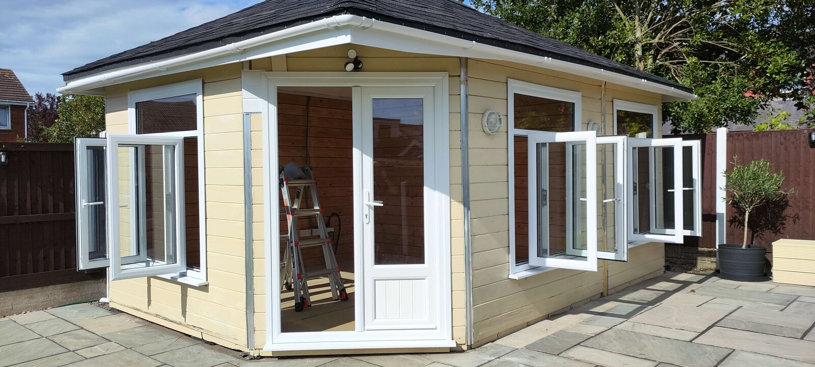 My brother-in-law has a summer house/man cave that is like two buildings put together under one roof. It is made with T&G outside, and inside the thickest T&G I've ever seen. It was £18k, so the former owner said. It has been put on a dirt base, not concrete/flags etc. just dirt. It is probably 10 years old now and wasn't new when the previous house owner bought it.