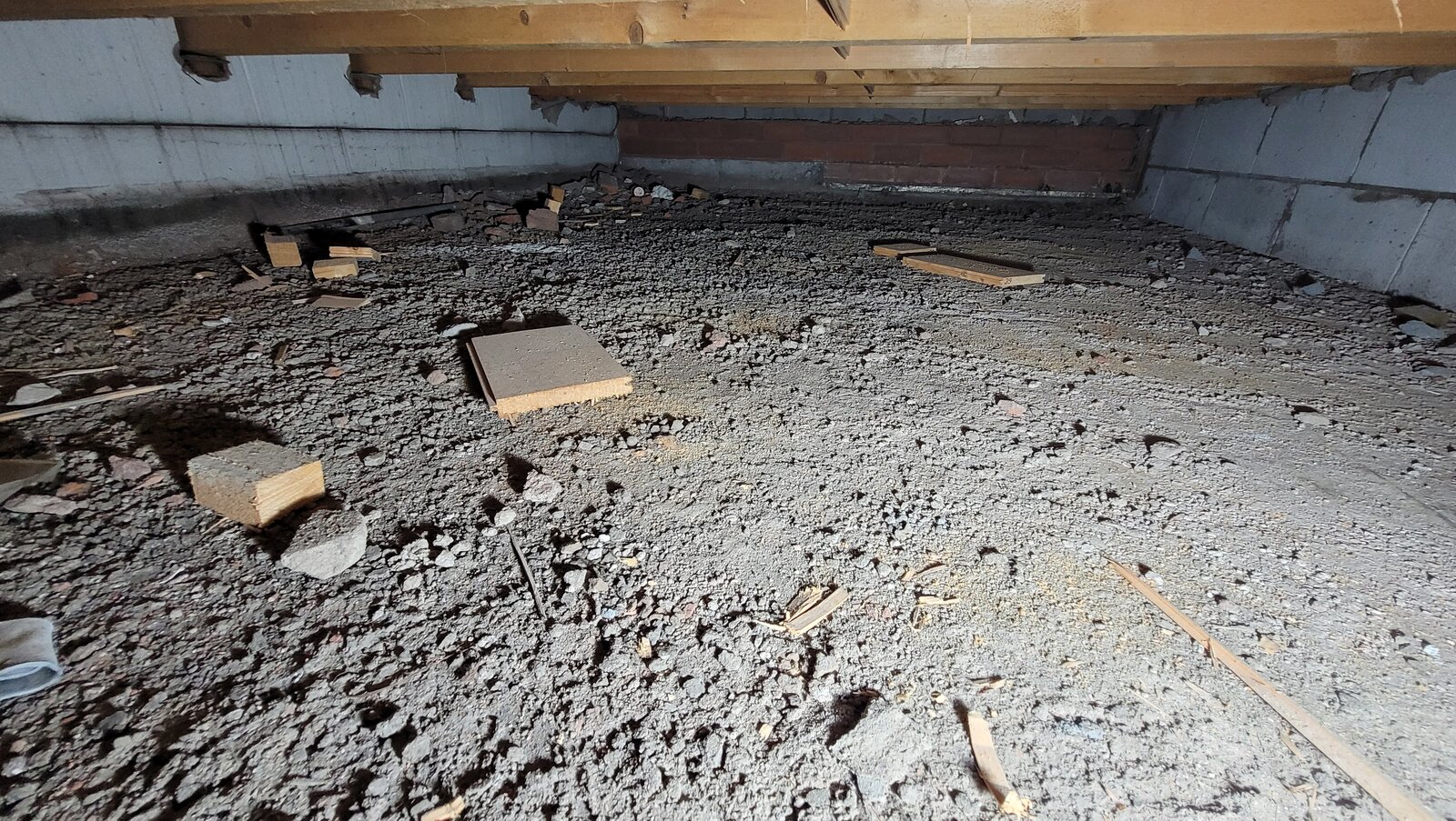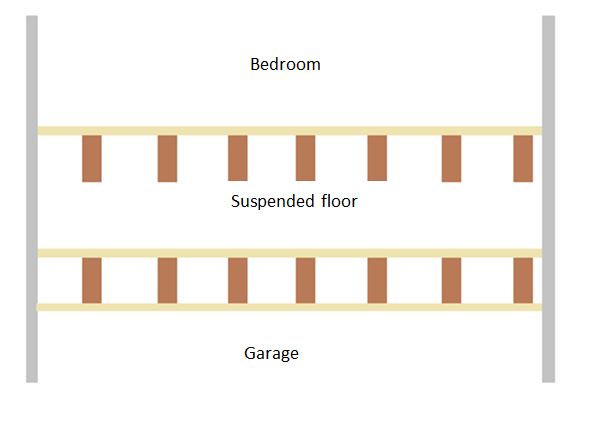 Usually I'd say this would be a simple job, just PIR or mineral wool between the joists, but we have an unusual set-up that might allow for an easier job than lifting all the boards. The bedroom is effectively built on its own separate joists to the ceiling joists of the garage, creating its own isolated sub-floor. I've attached some photos of this and a crude image showing the set-up.
