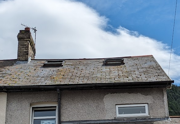 After looking closely at the gable, the purlin ends look to be rotting away, and the rafter which I assume is holding up the slates & overhang above looks to be in a state. Scrolling back in time on google maps shows the slates were replaced around 15 years ago, but all of the pvc covers etc. which protected that end are long gone. I reckon it's all been exposed to the elements and ill-maintained for many years since. Several tiles have slipped/blown on off in the interim - this must be a windy corner.