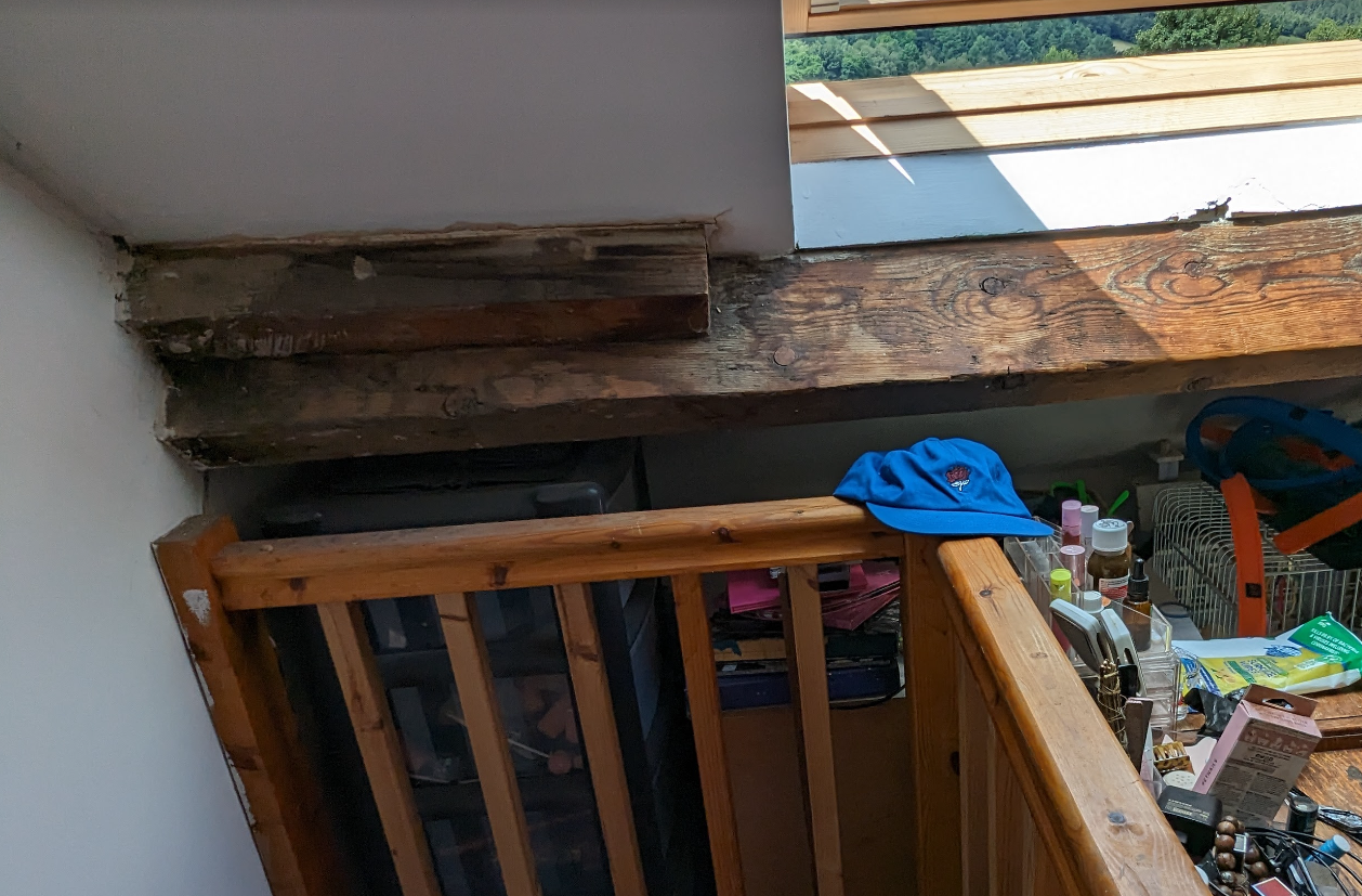 A loft room with velux windows was added in 2011, but the roof appears to have a bow in it that's been there unchanged at least since 2009 according to street view. Some damp looks to have affected the plaster surrounding one of the exposed purlins in the loft, which has been reinforced at some point.