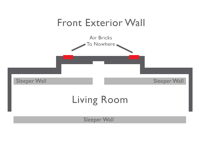 The front wall is three bricks thick at the foot of the small bay window, and on the outside there is one air brick in either corner of the bay. However, on the inside there's no correlating hole. There's a gap in the bricks in the middle of the bay that's two bricks deep, and this just dead-ends against the outer wall. The sleeper wall nearest the bay also has a venting gap in the middle, but none of the others have.