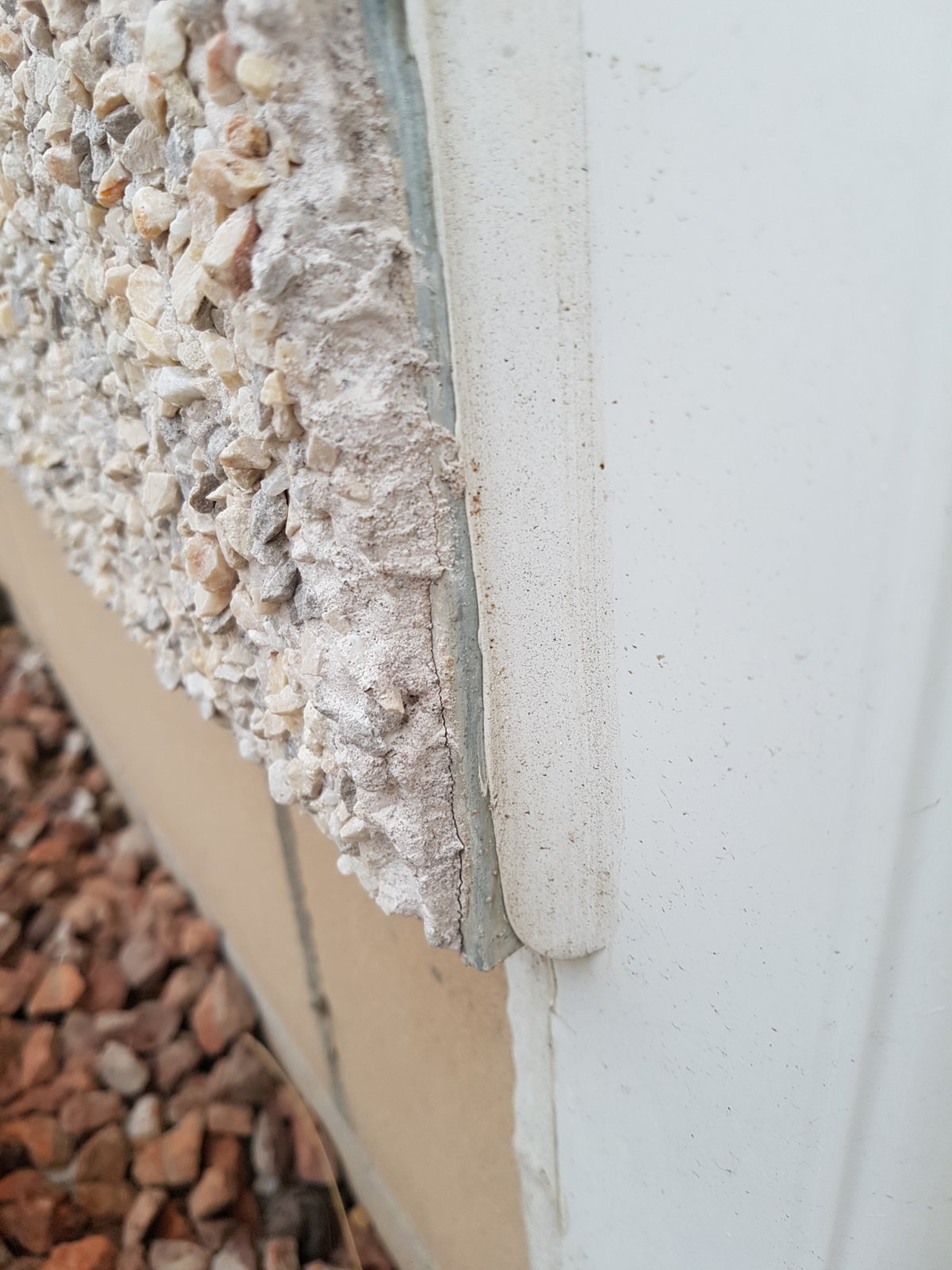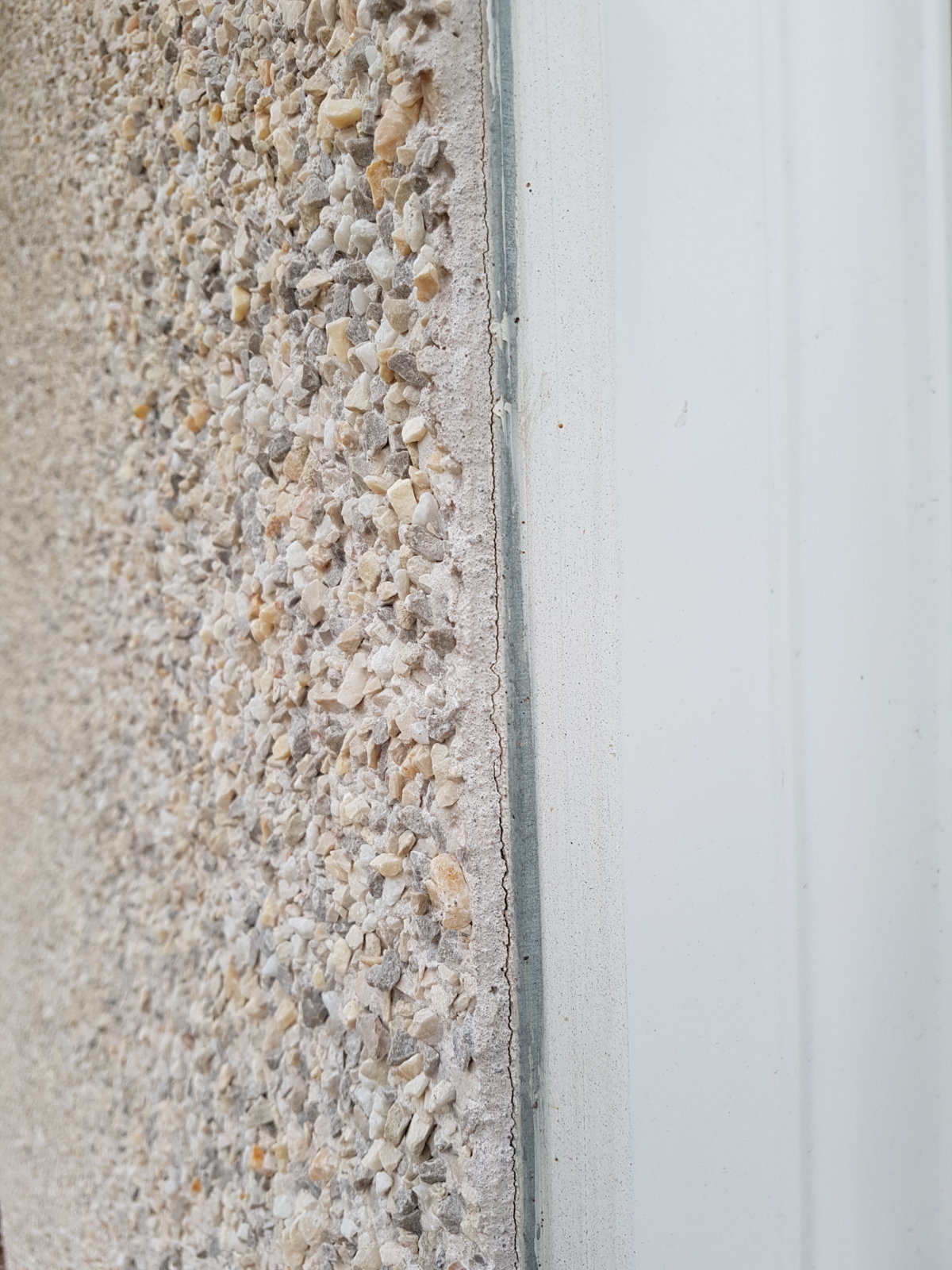 I'm in a 9 mth old new build house and a few months ago noticed cracking to the roughcasting around the external garage side door. The builders said it was their fault (I think they said the side garage door had been put on before the roughcasting had been done instead of other way around - I might be mixed up with that). The roughcaster came out and redid the whole side of the wall which worked for a couple of months however I've noticed cracks starting to appear again around door frame. Is there anything I can do to limit this like some kind of caulk? I'll attach some photos to show it.