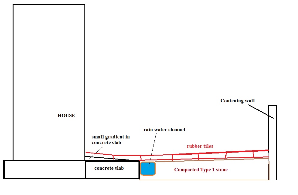 1) Do I need to install a water channel under the tiles to drain the water off the type 1 layer or the water channel will need to installed at the same level than the rubber tiles as it will not be much rain water passing through the water tile?