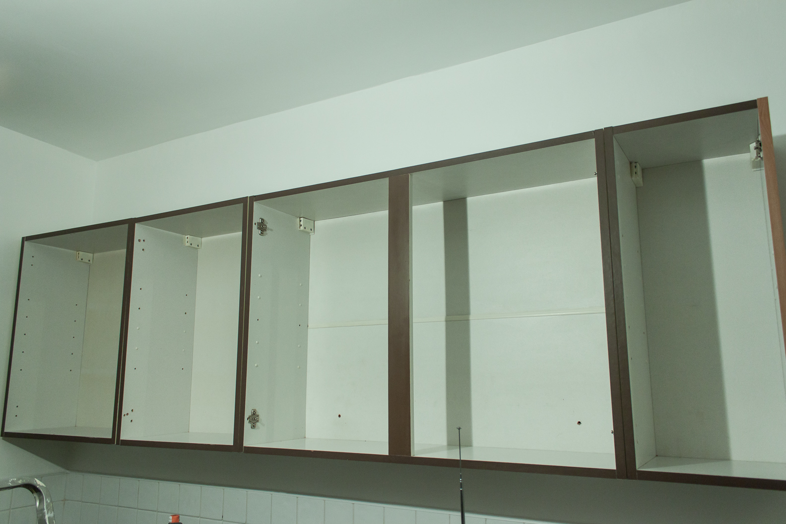 However, on the run of wall cupboards where multiple carcasses are screwed together, only the central one has the two further anchor screws. The smaller cupboards either side, don't. They just have the top wall hooks.