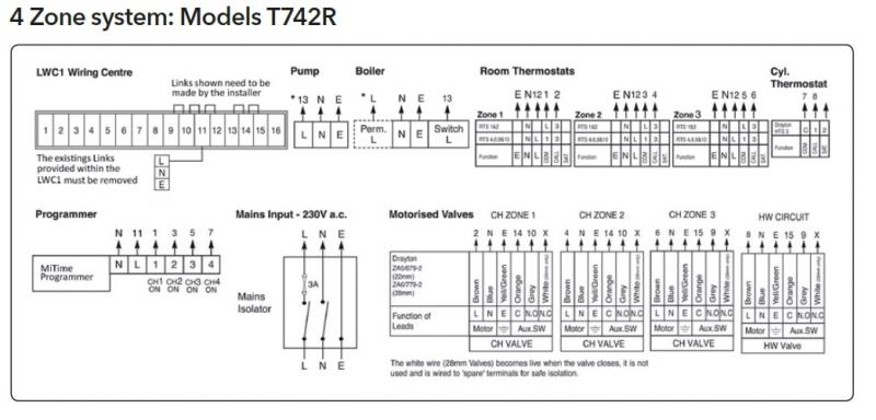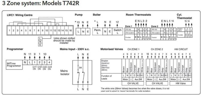 Valve: 3 into Honeywell 22mm 2Port valve: 1>Heating Downstairs. 2>Heating Upstairs. 3>Heating Hot water.