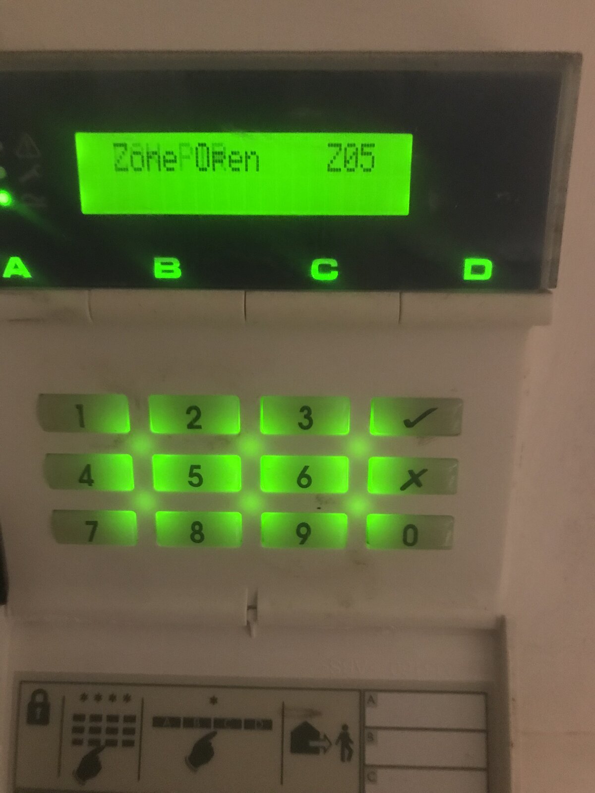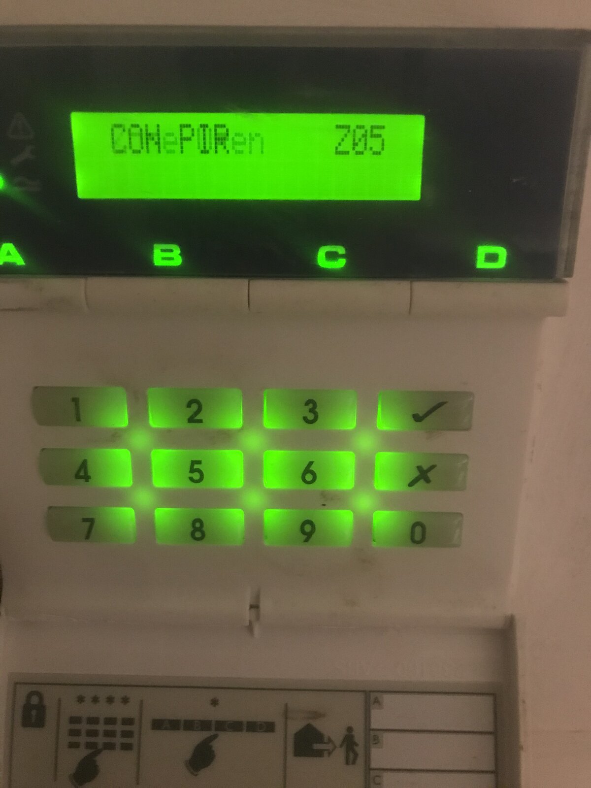Hi I wonder if anyone could help me. Recently had engineer put due to low battery. Tried setting first time after he came out and when enter alarm code - set - normally final alarm goes off. Now getting messages saying “con pir Zone 5” then it comes off and alarm won’t set. Just wanting to put my alarm on to leave the house. Anyone any suggestions thank you