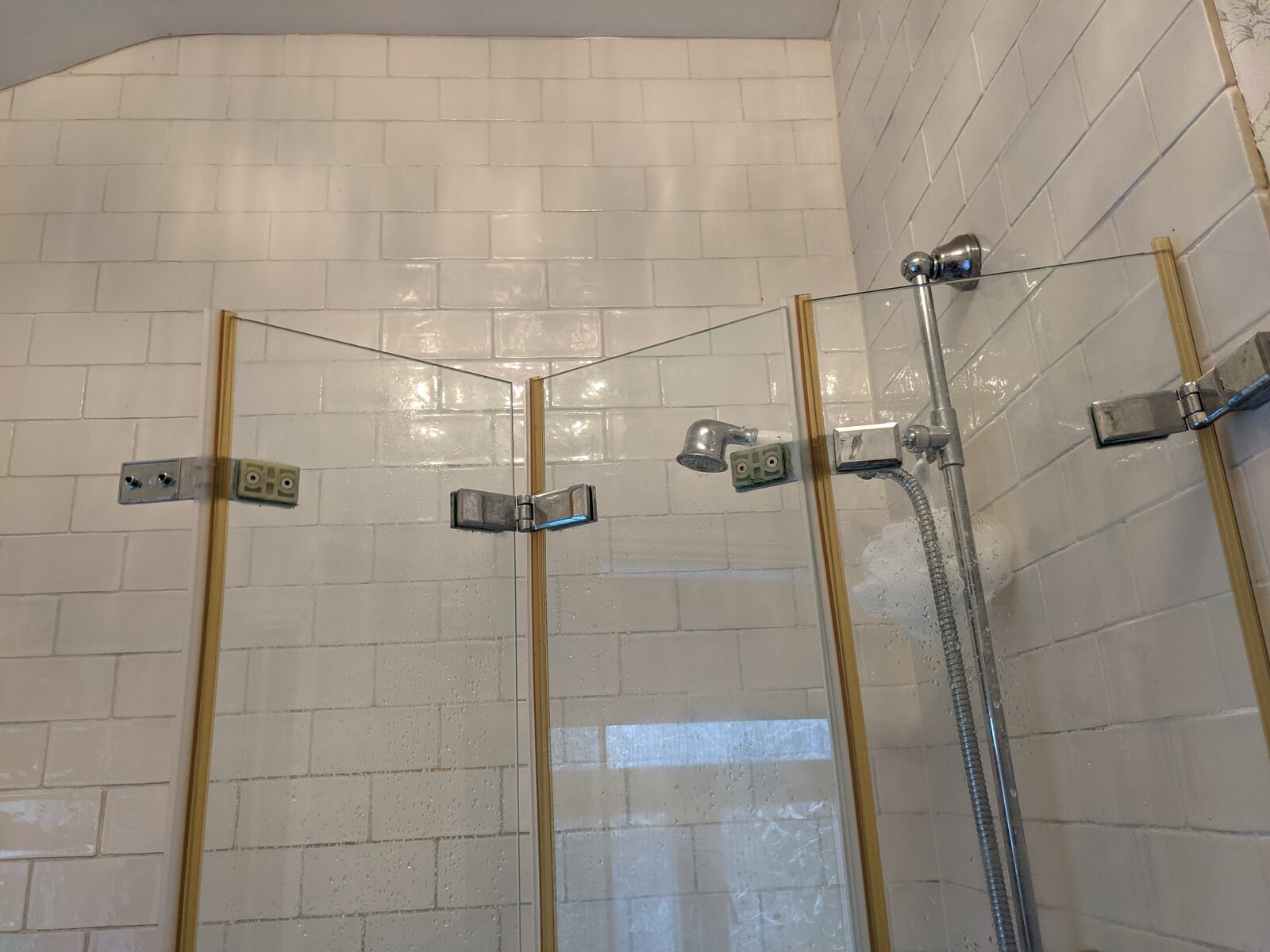 We have a 4-panal, frameless glass shower screen (pics attached).