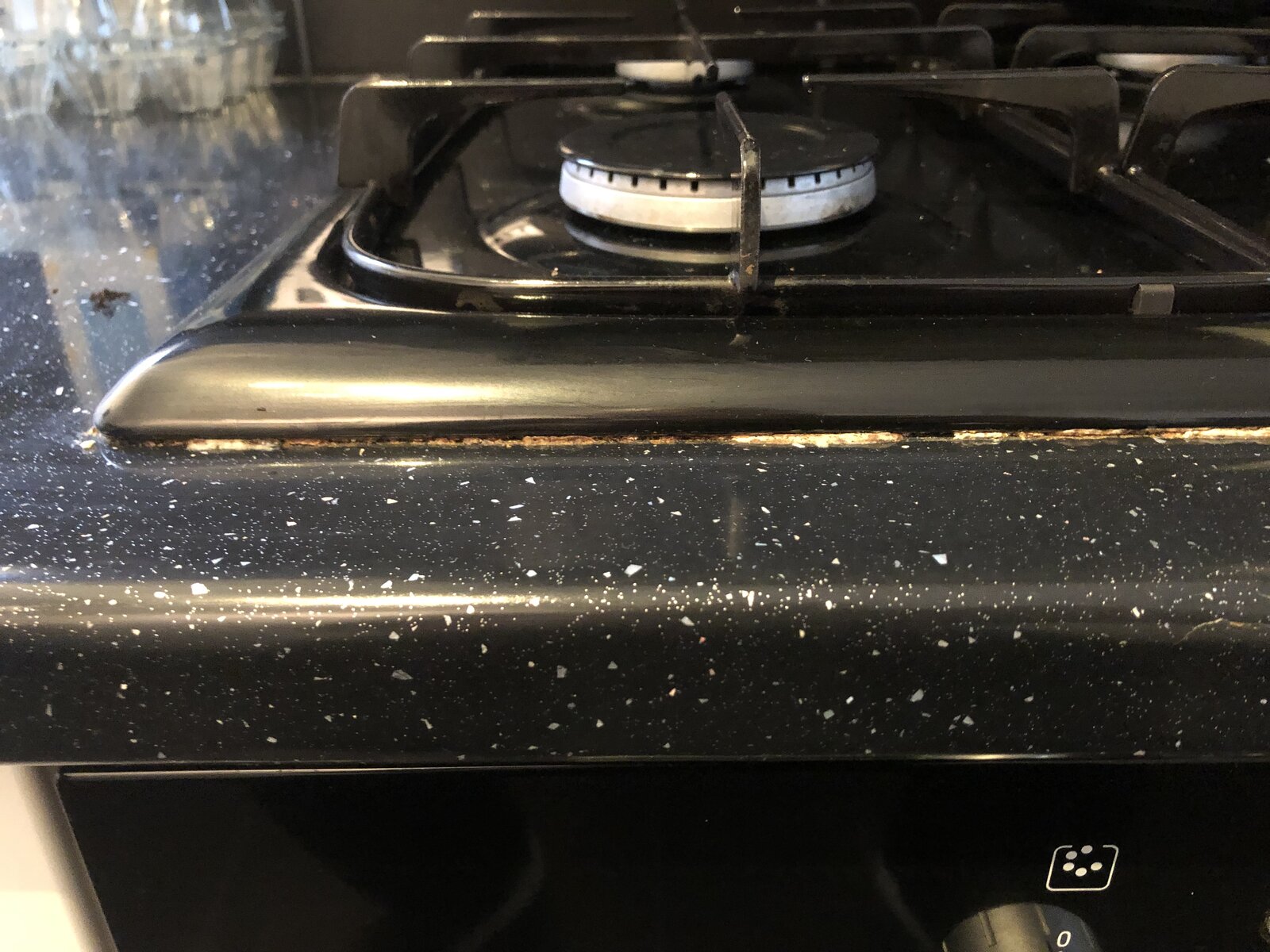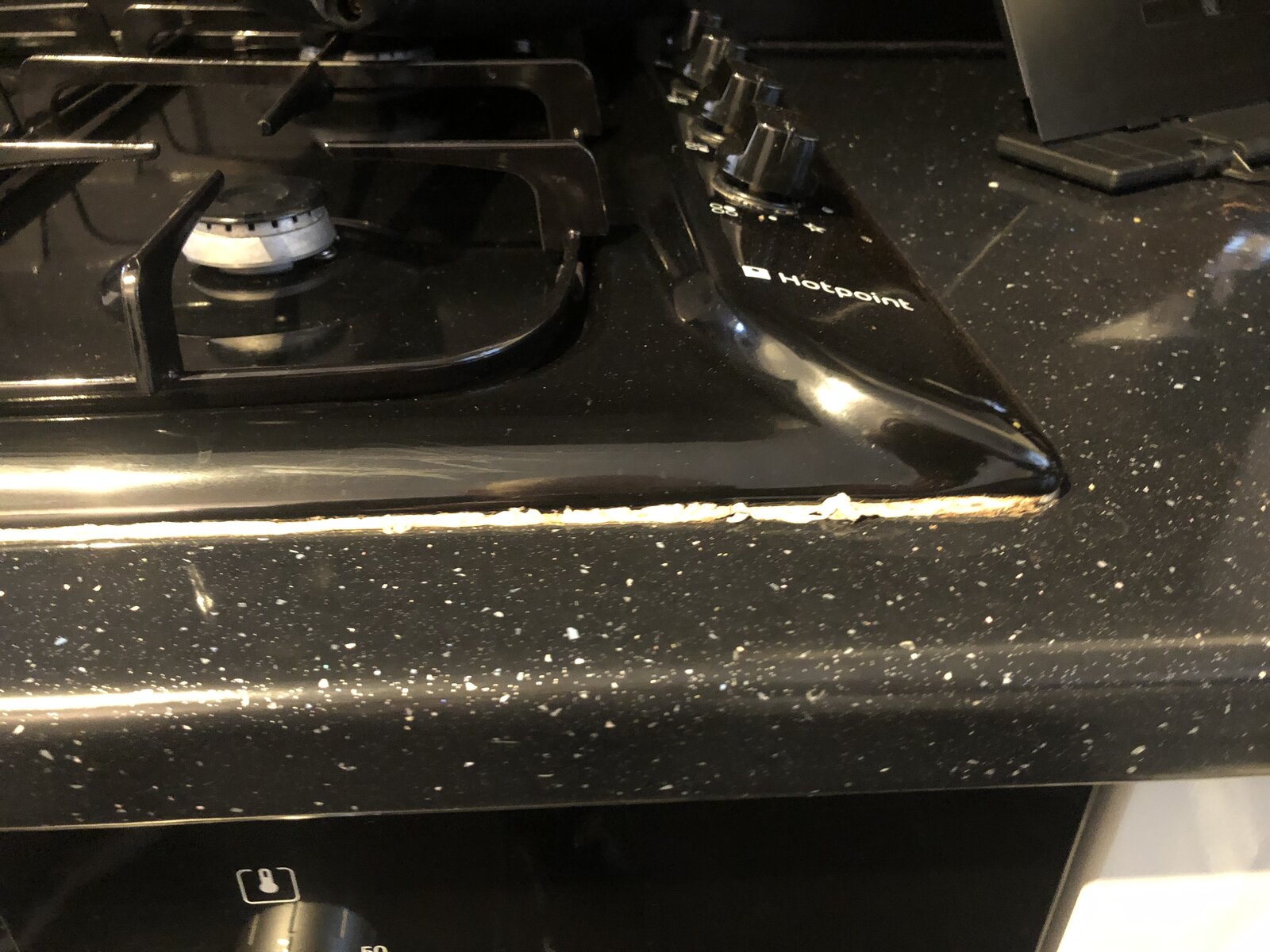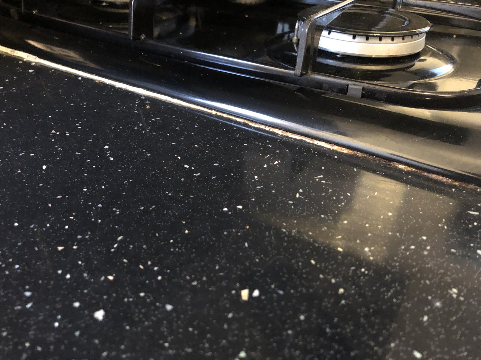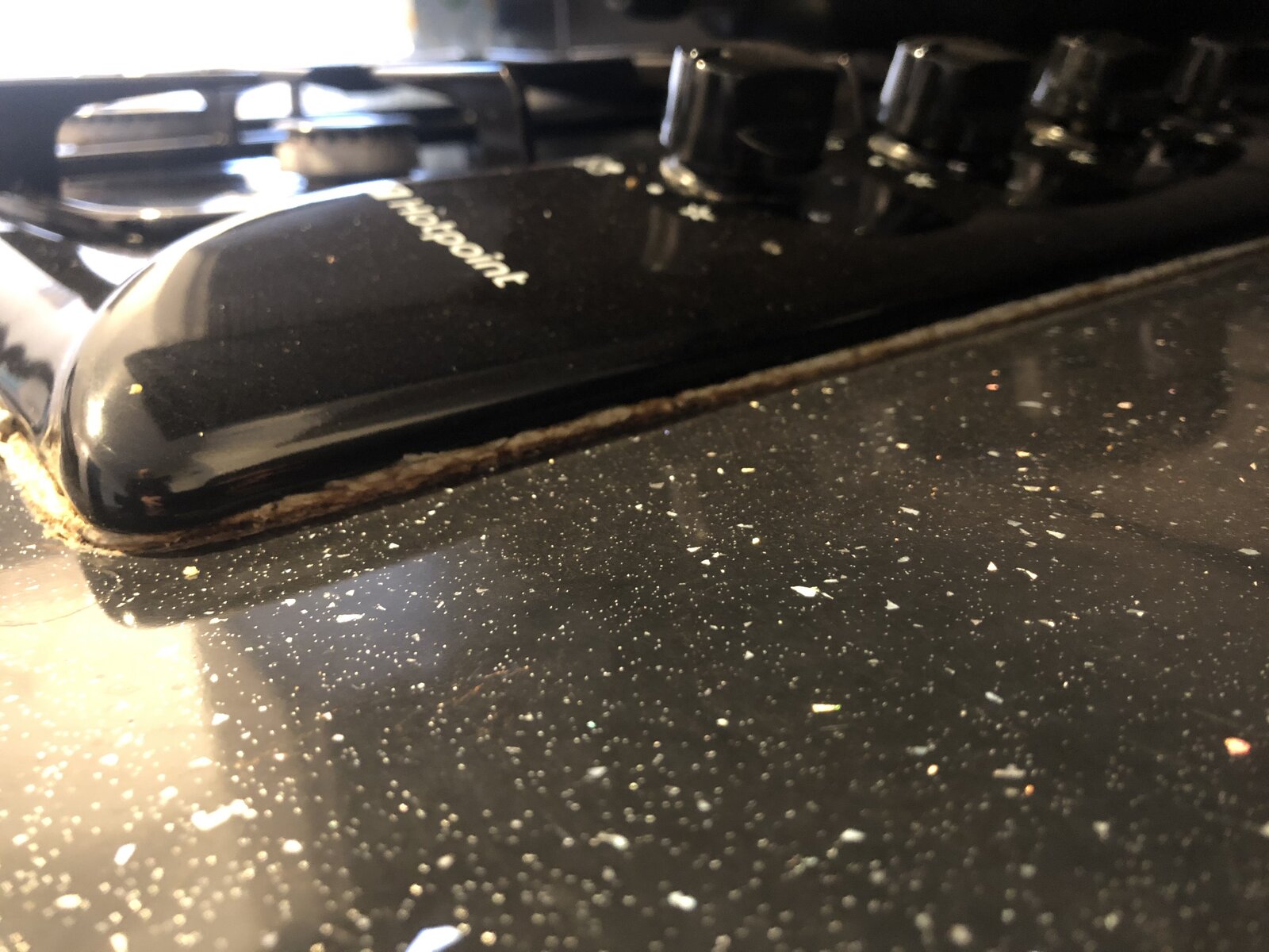 Was wondering if anyone has any ideas the best way to fix it? With it being a gas hob I'm obviously not wanting to touch it too much. I had considered just getting a scalpel and cutting the manky bits away and finishing it off with a darker sealant.