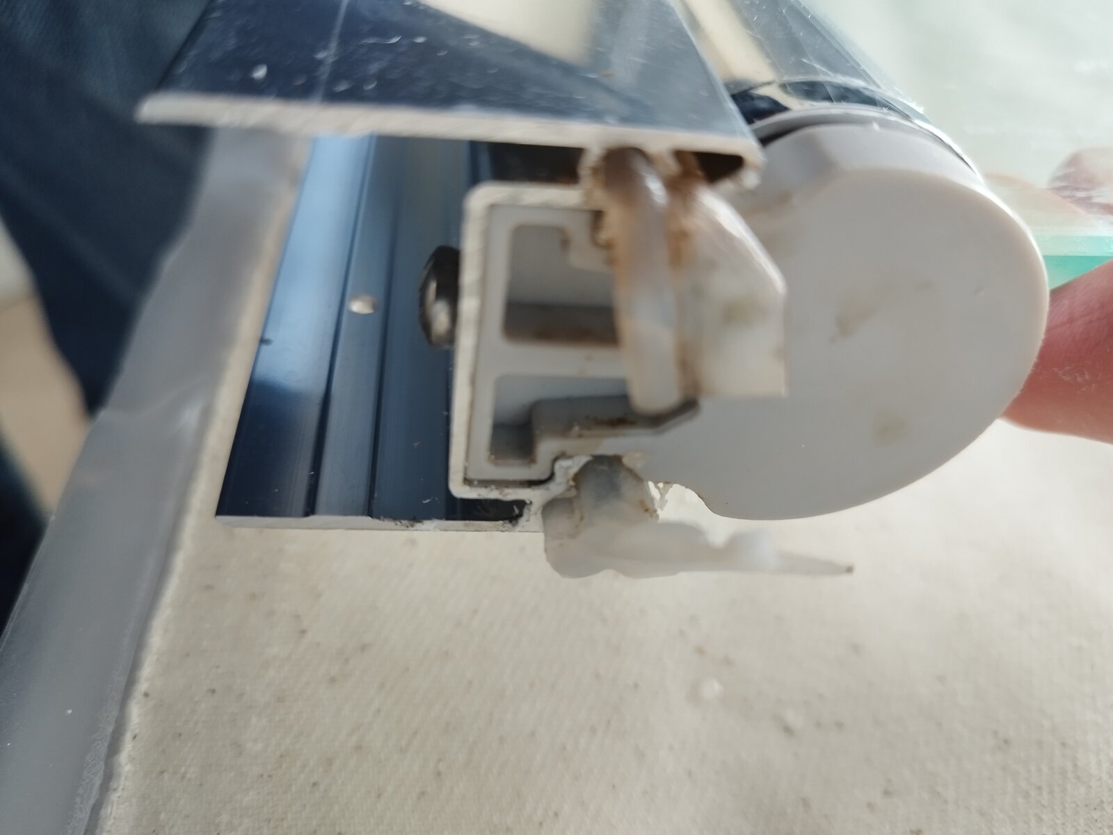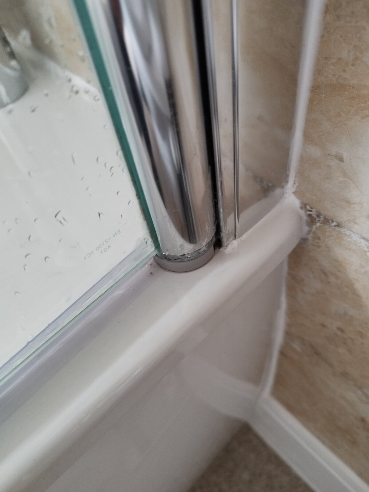 First photo is bottom of the shower screen where it sits on the bath. The two bits that are folded over are they supposed to be there (I didn't fit it)? There was a blob of sealant under it too? Is that supposed to be there too? That's where it is leaking, where the screen swivels to & fro.