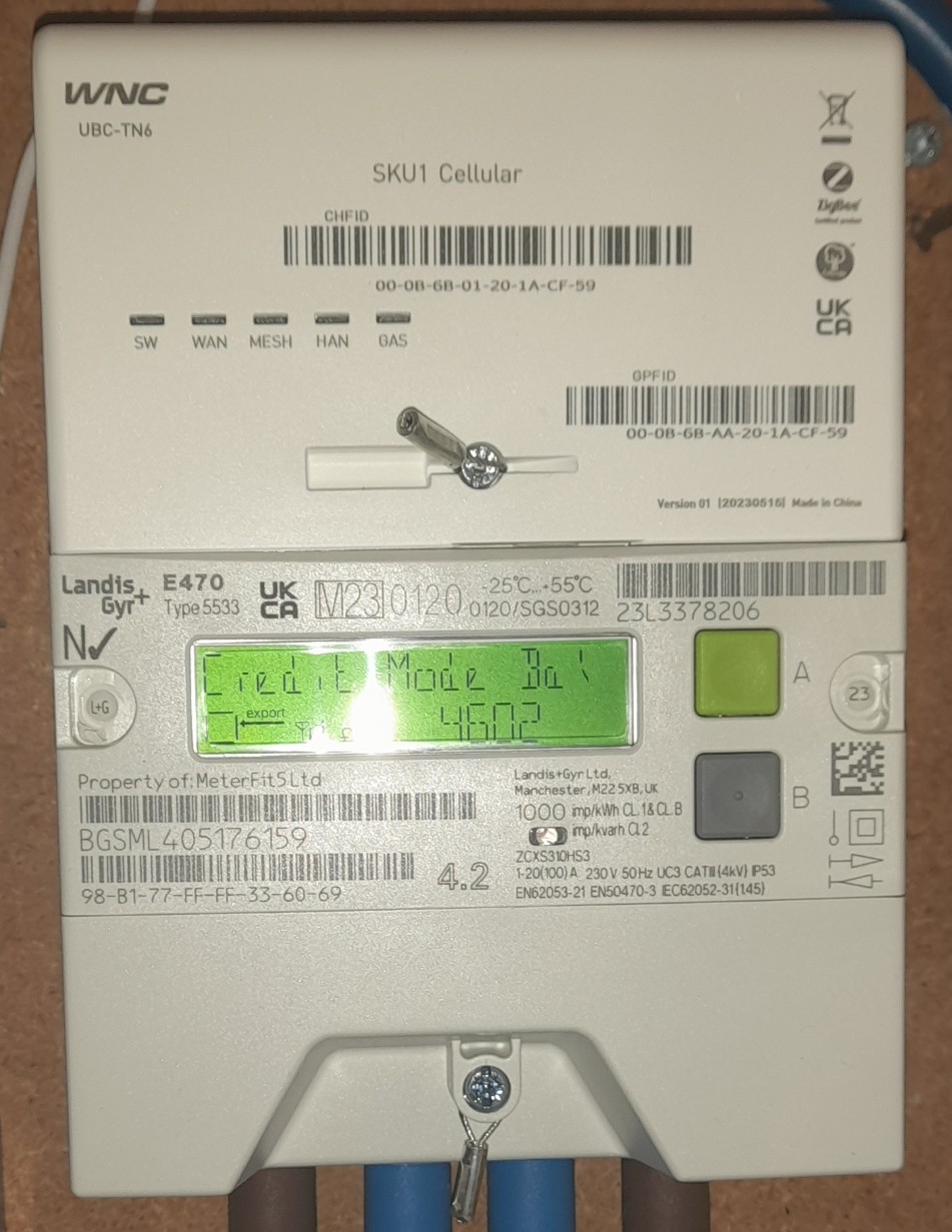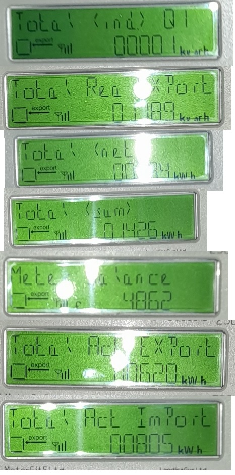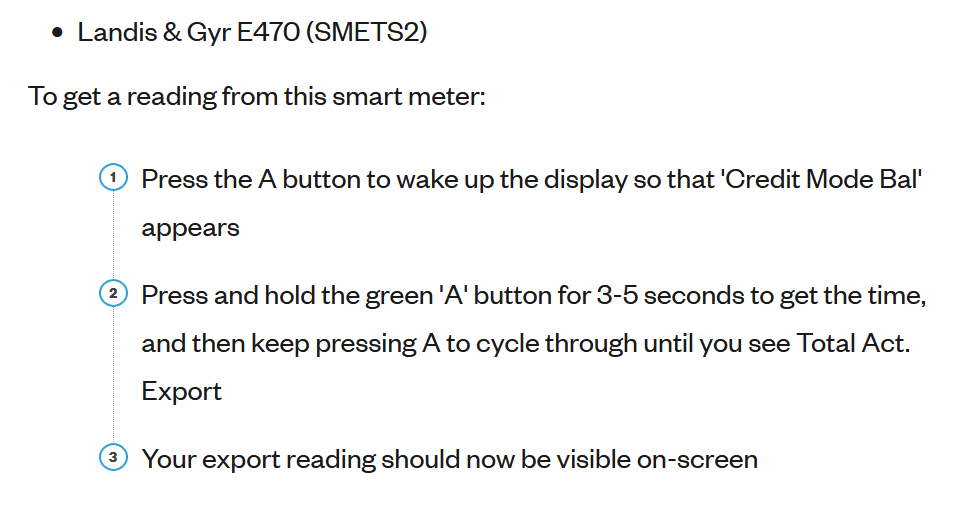 The meter shows 4602 and from my app it would seem that is 460.2 kWh although can't see any point, however I would have expected at least three readings, import peak, import off peak, and export. I have tried pressing button B and got no money back, one screen says Boost? another everything X'ed out. Hunting armed with make and model I get so returned and tried holding the A button, to start with nothing new, then found which does give some idea as to what is going on. And further got which has left me wondering what is what, is what, the estimated reading of 05 Mar 2024 of 414.6 does make me think meter is missing decimal point, but scratching my head to work out what is what.