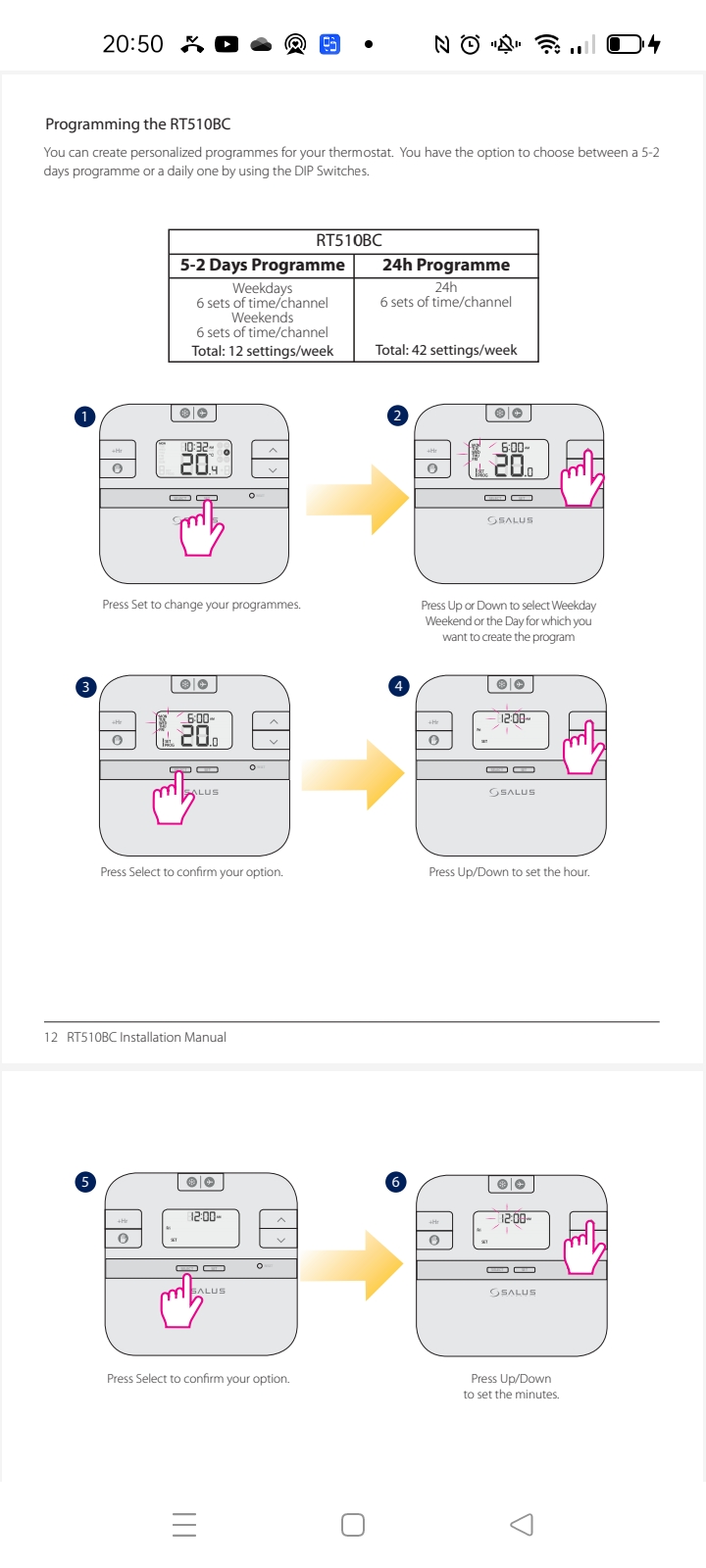 The instructions say that the 5+2 setting gives you "12 settings per week" and the 24hr setting gives you "42 settings per week".