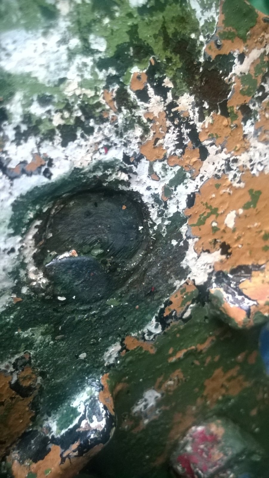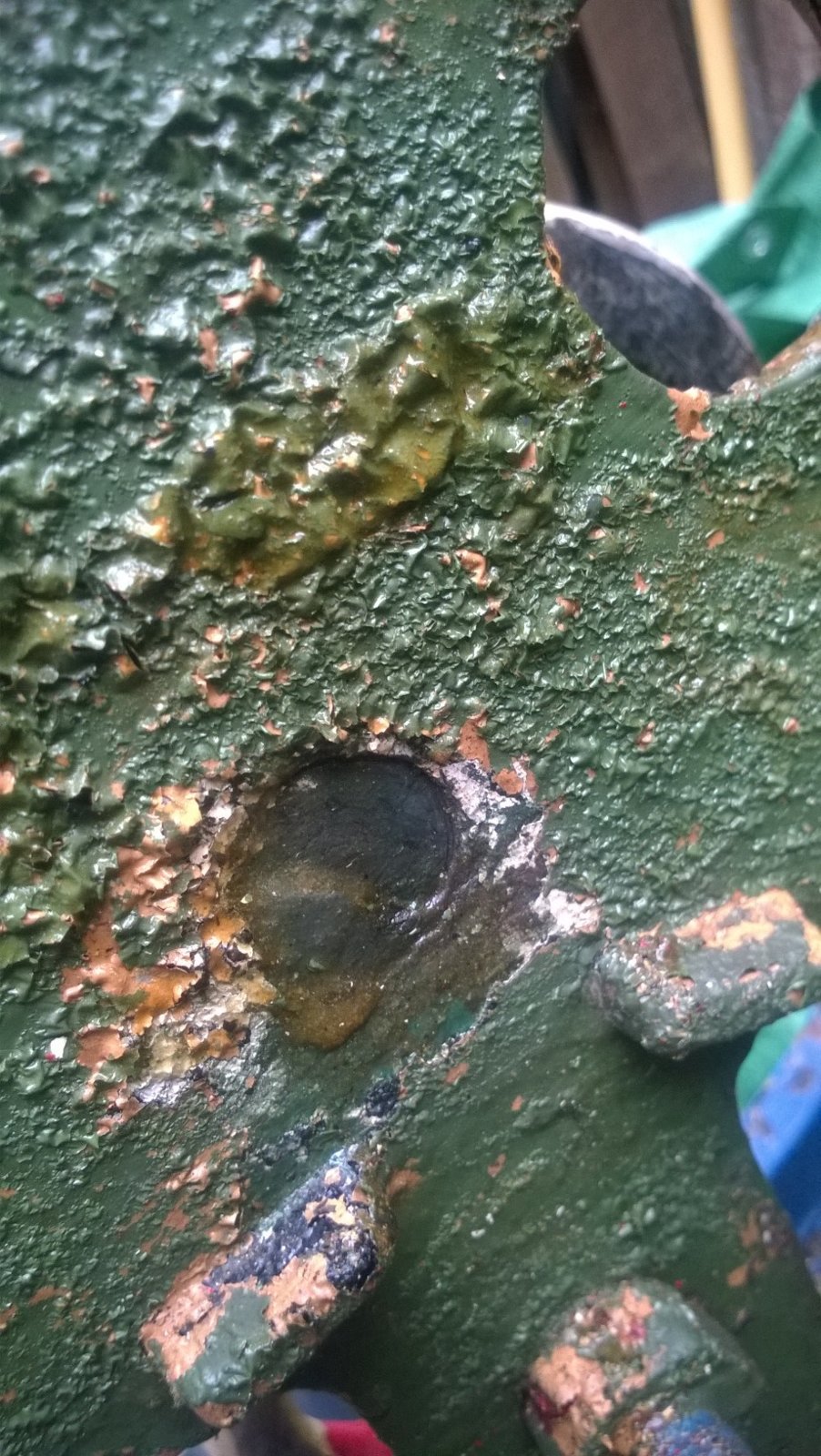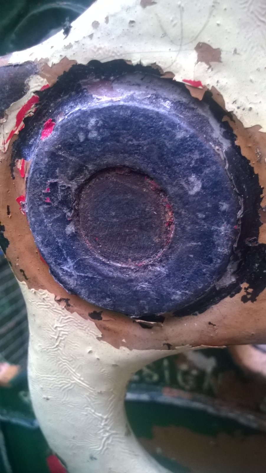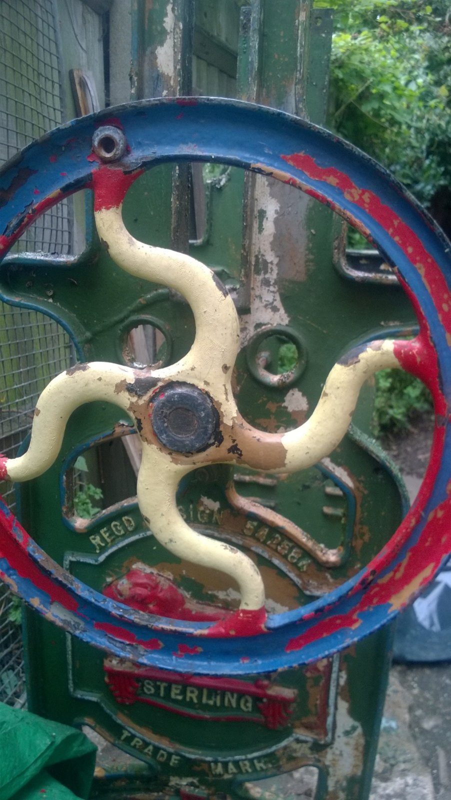 I am renovating an old mangle. The wheel is jambed and it looks like a cotter pin holding is has been sheared off on the inner side. I need to knock it out and replace it with a rod that seems to go from the other side and through the wheel.