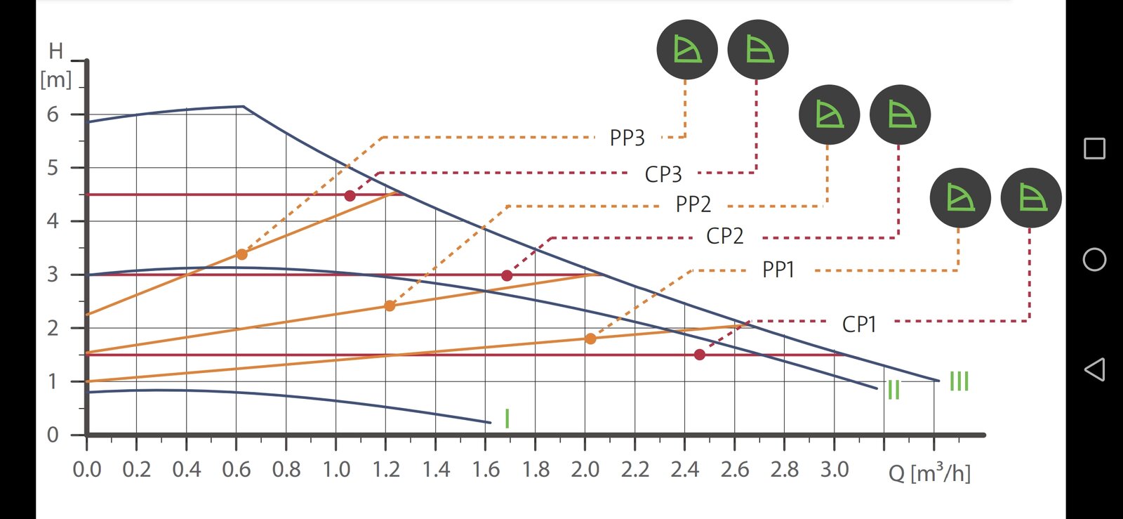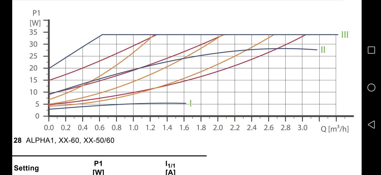 You will see power in W on the vertical axis, and the flowrate in m3.hr on the bottom horizontal axis, you know that the pump power is 28watts so draw a line horizontally to the right from 28 until it intercepts the Constant curve III, (your setting) then drop down vertically to the bottom horizontal axis and you will see that the flow is 0.41m3/hr = 6.83LPM, very poor for a pump that is running at a 6M head. Your flow rate should be at least 12LPM so problems?.