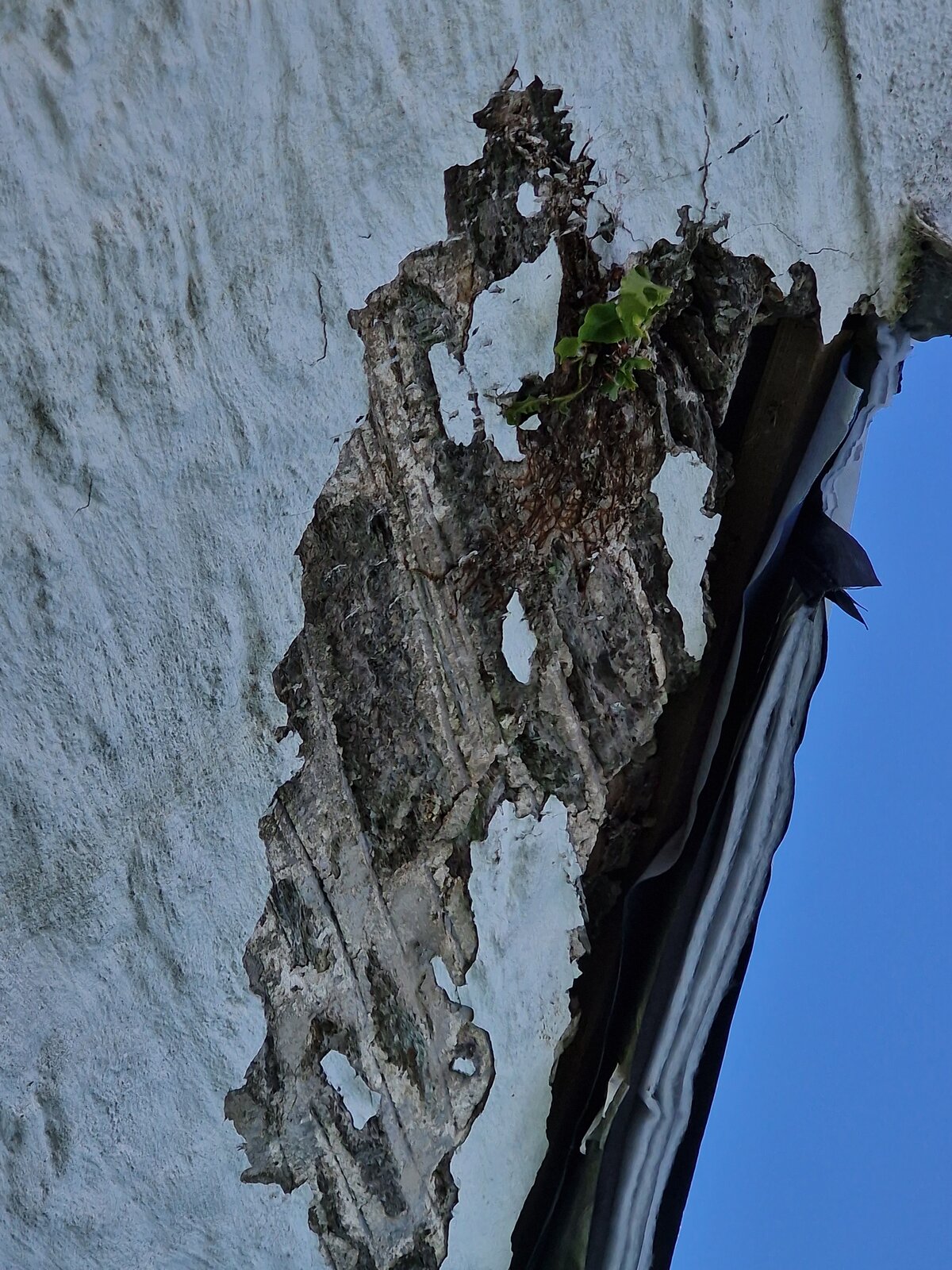 Some friends purchased property a few months ago and are currently having g it reroofed . The walls are cob and stone predominately. The roofers ( who are also a building company ) have raised the fact the render is blown on the wall in the picture and the cob is absolutely soaked through. My question is , should a surveyor have noticed this? particularly as there is a plant growing out it! I appreciate the missing render has probably fallen off as the roofers worked. This is on a gable end and the surveyor says he ' couldn't get to it' ...