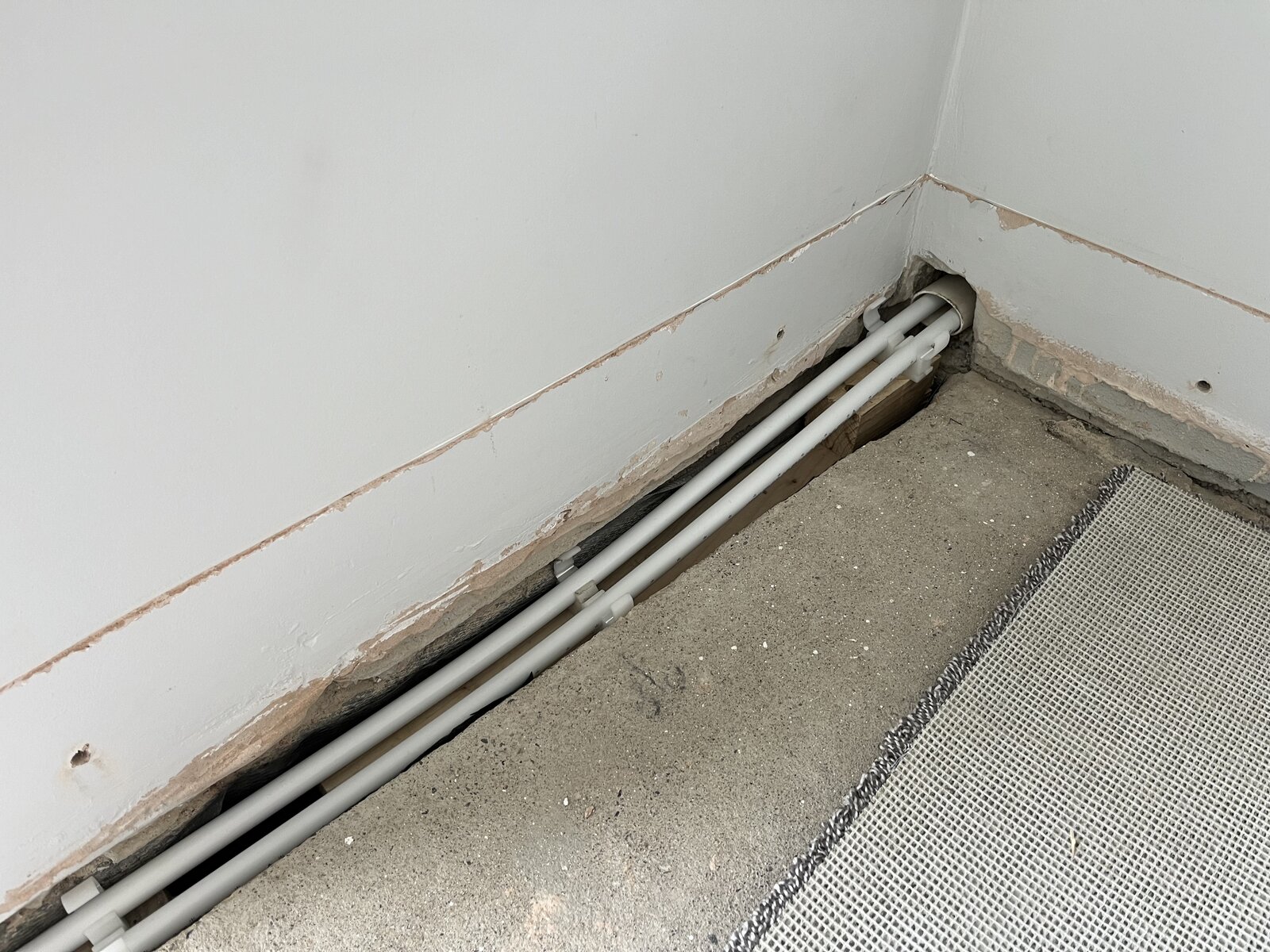 I finally got my JG speedfit pipe in to replace the leaking copper. As you can see, it’s in a tight channel cut out of the concrete floor in the new kitchen extension (fully insulated). When the laminate flooring is back down there’s not much room to lag the pipes in foam insulation without causing a bit of sag on each 300mm between the clips.