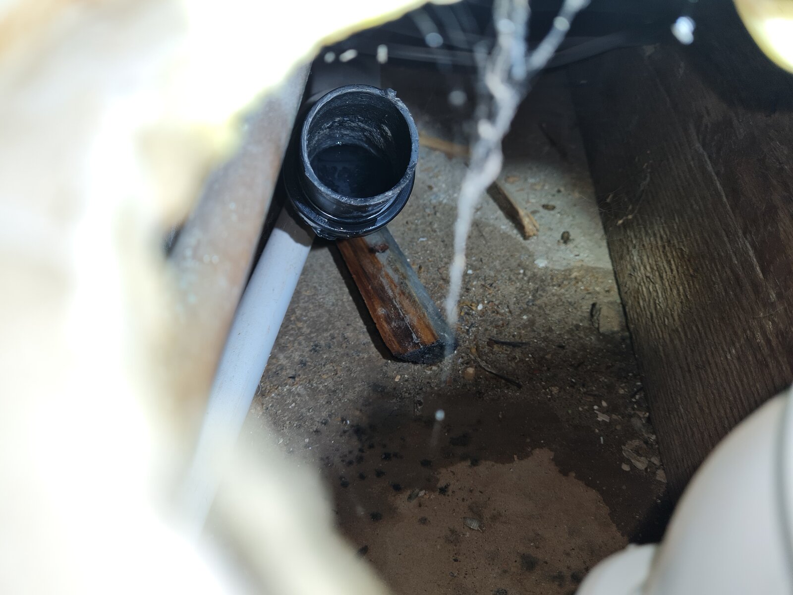 The two pictures show the black pipe that I can see has leaked and the end of the trap that was on that pipe and fell off.
