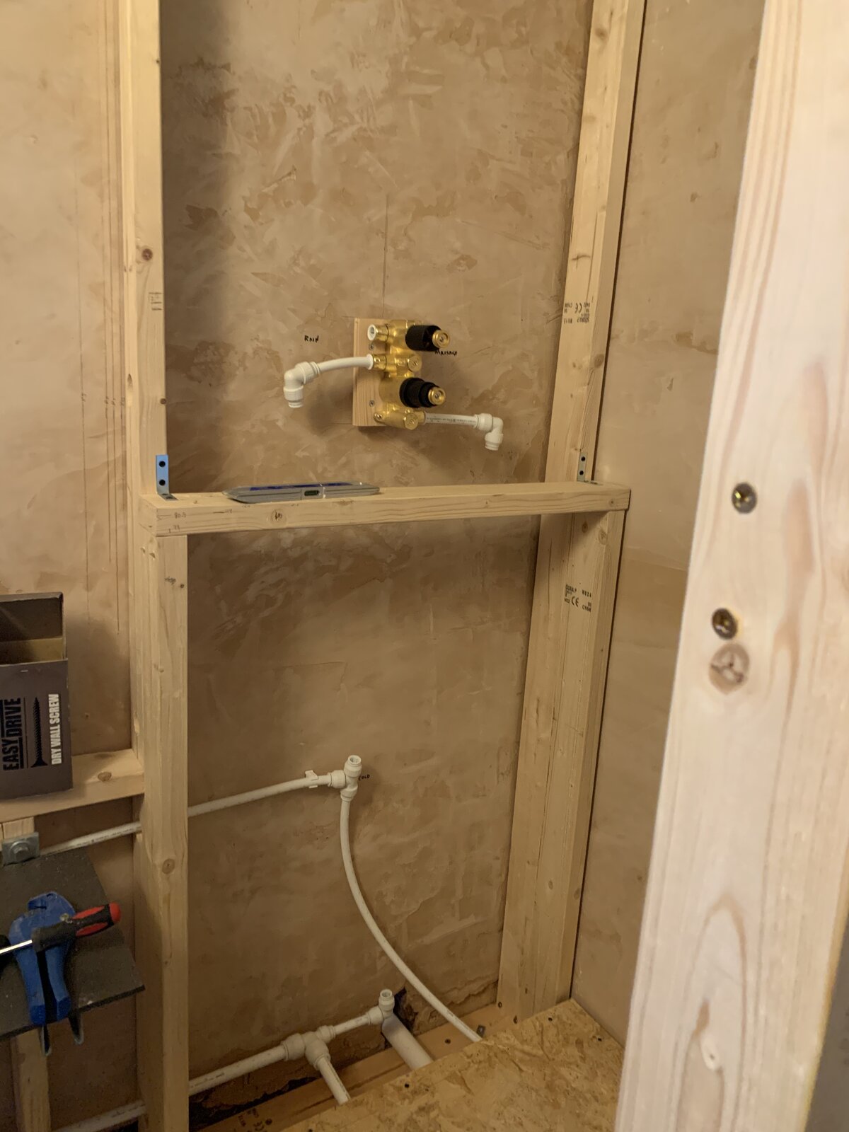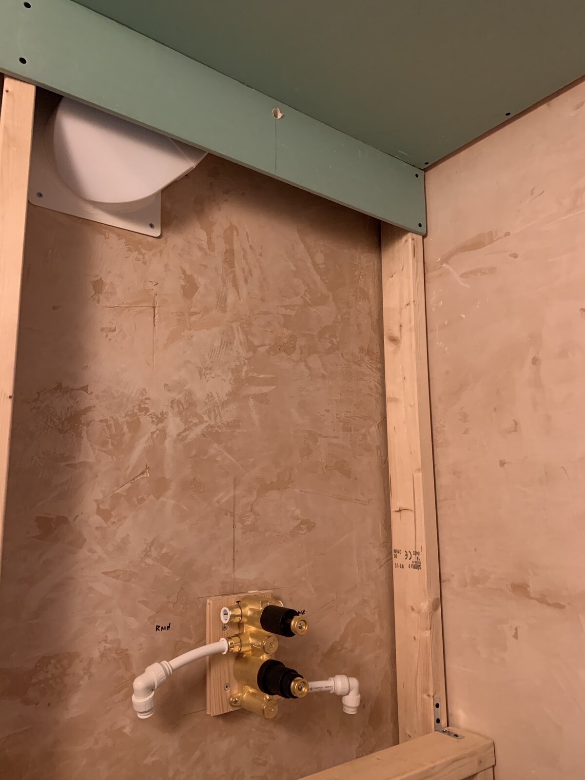 attached are pictures of my install so far. I’m going to fit copper tails onto the push fit elbows. I’m going to have plasterboard, then PVC panels instead of tiles.