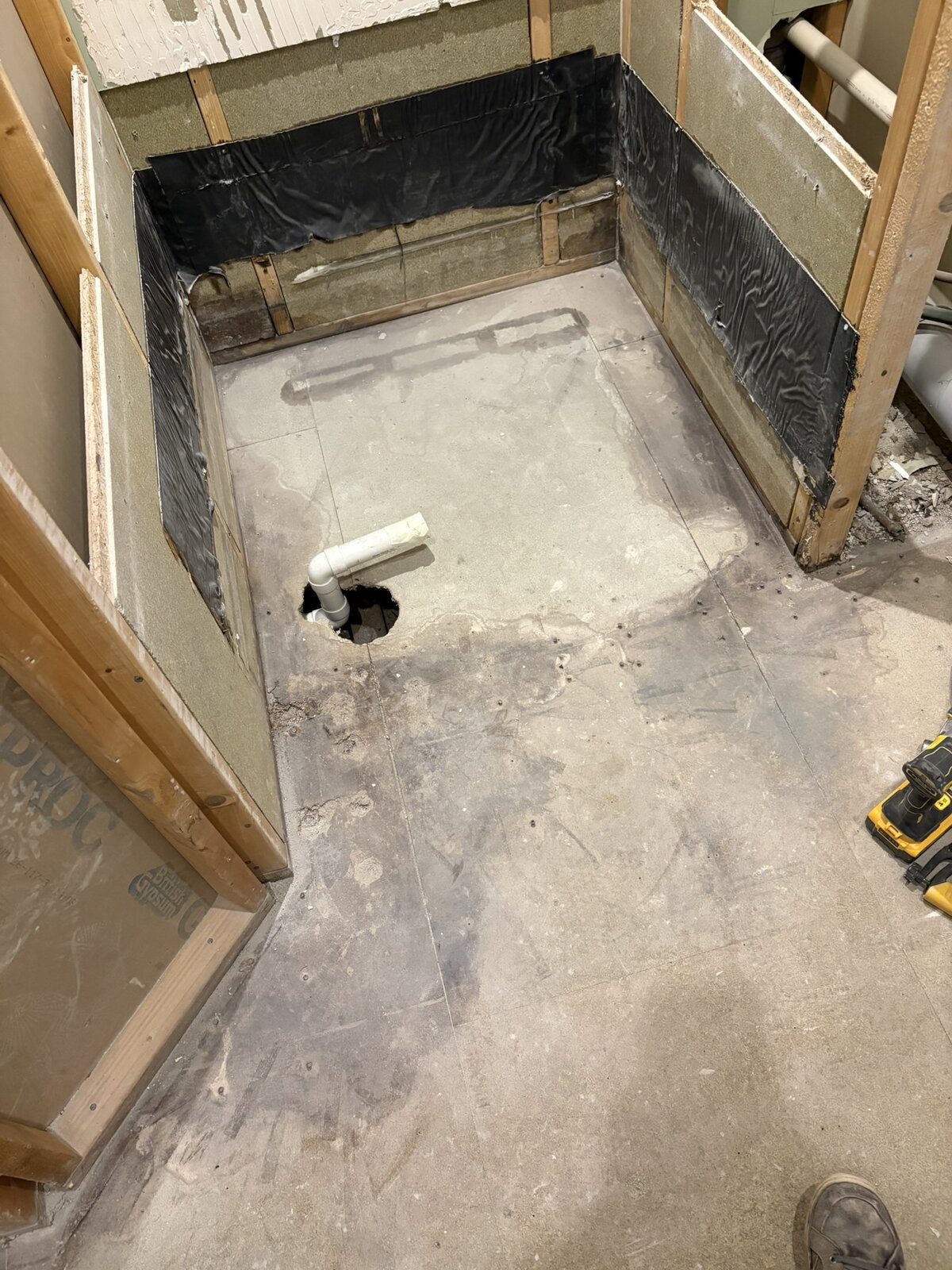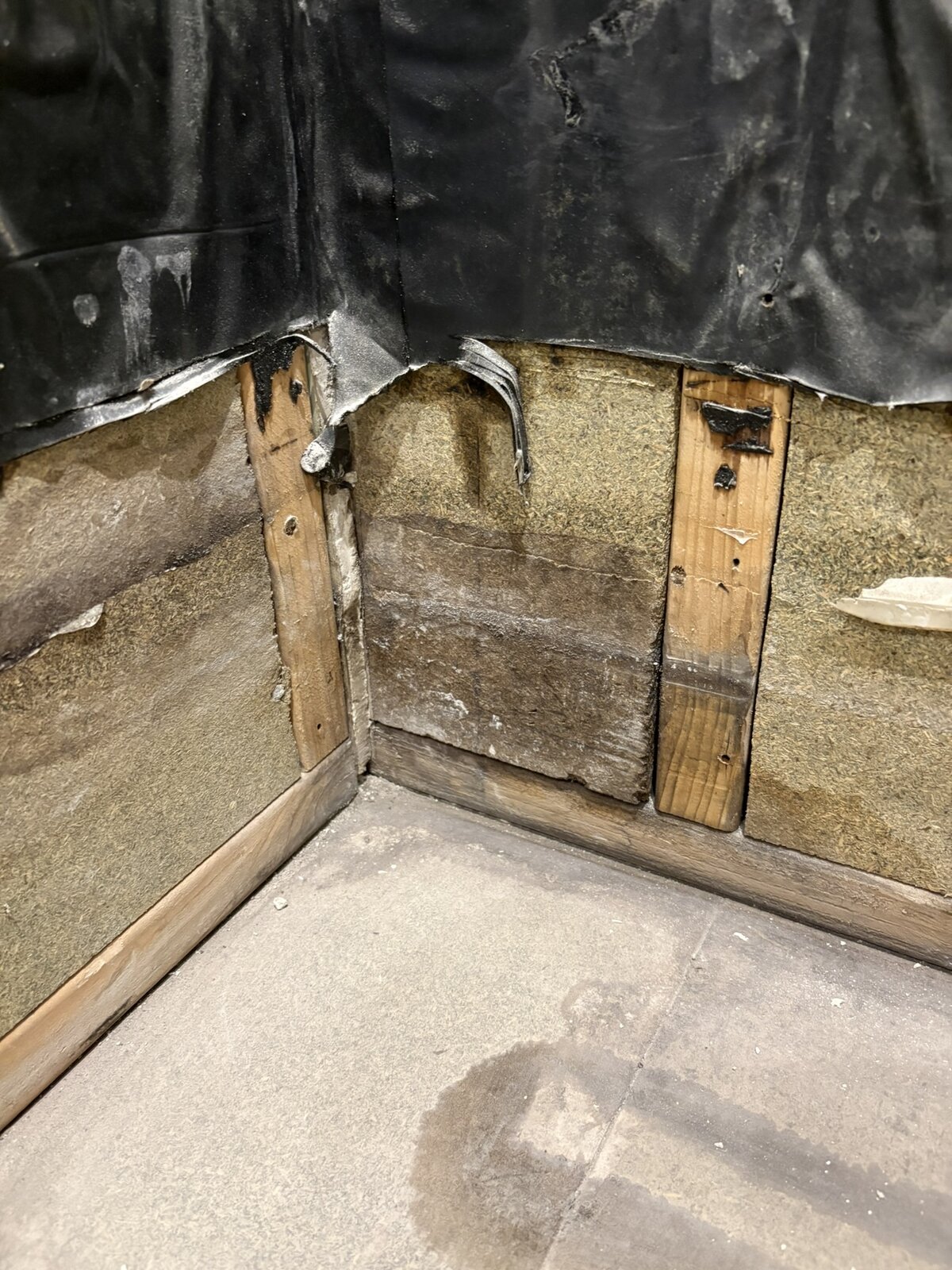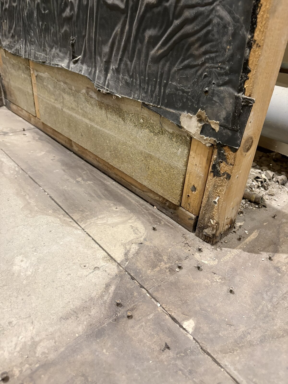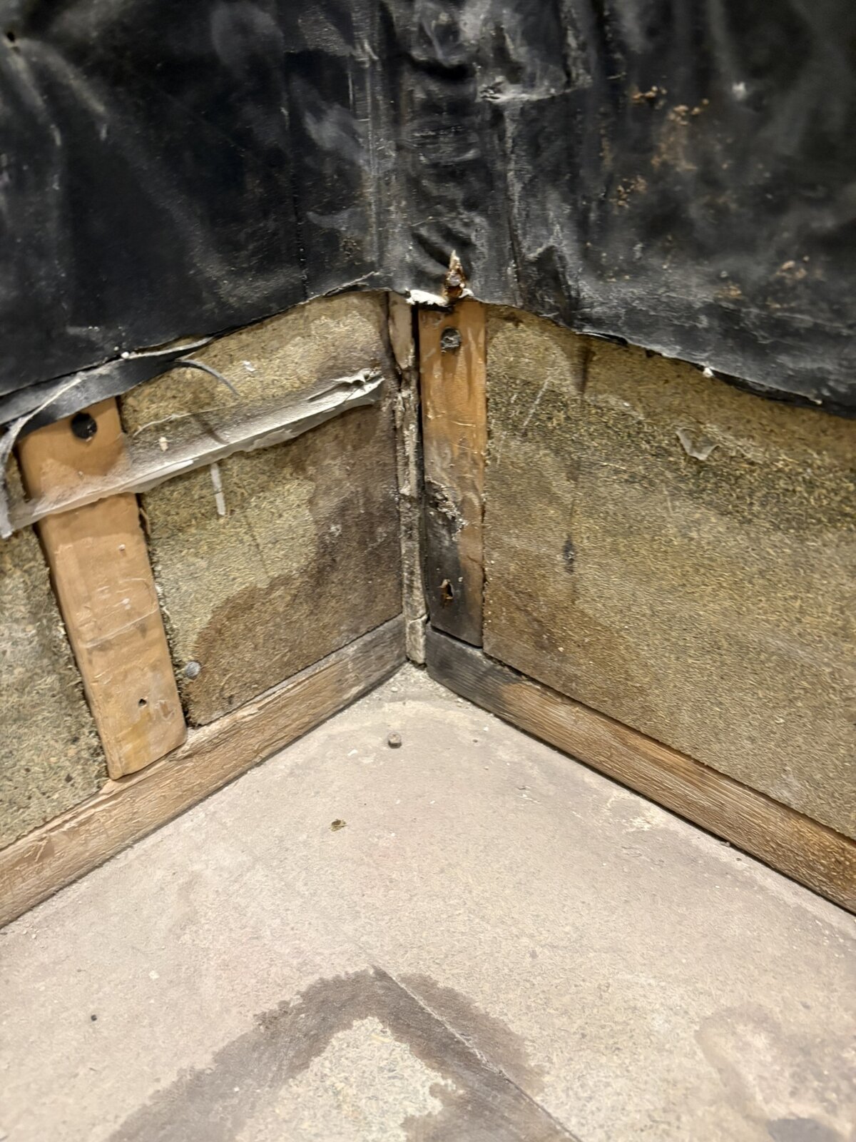 From what I can tell, there was originally tiles on the shower and a fairly high shower tray, going by the remaining waterproofing strips. At some point in the past, this was replaced with a lower tray and shower wall. There was no attempt to replace the water proofing membrane and you can see in the picture where the silicone was around the tray - far lower than what was left. There was plenty silicone around the tray itself, but as there was none higher up on the corners it still leaked, and run all the way to the front, and under the the tiles. The whole floor was laid in MDF that was really rotten in places, however the floor boards are much better. Interestingly enough, the shower tray was too wide for the cutout and the plasterboard was cut above the tray with the silicone directly on the wood panels, which probably hasn't helped.