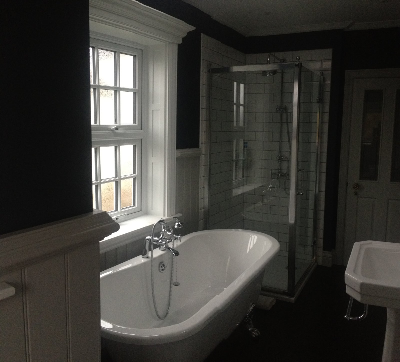 Bathroom was completely stripped back to bare brick. Shower area was created with a small partitioned wall for water pipes to hide behind. Dry lined with water resistant plaster board. Plaster board sealed prior to professional tiler coming in and tiling the 2 walls of the shower area.