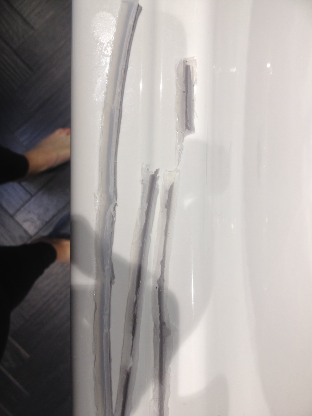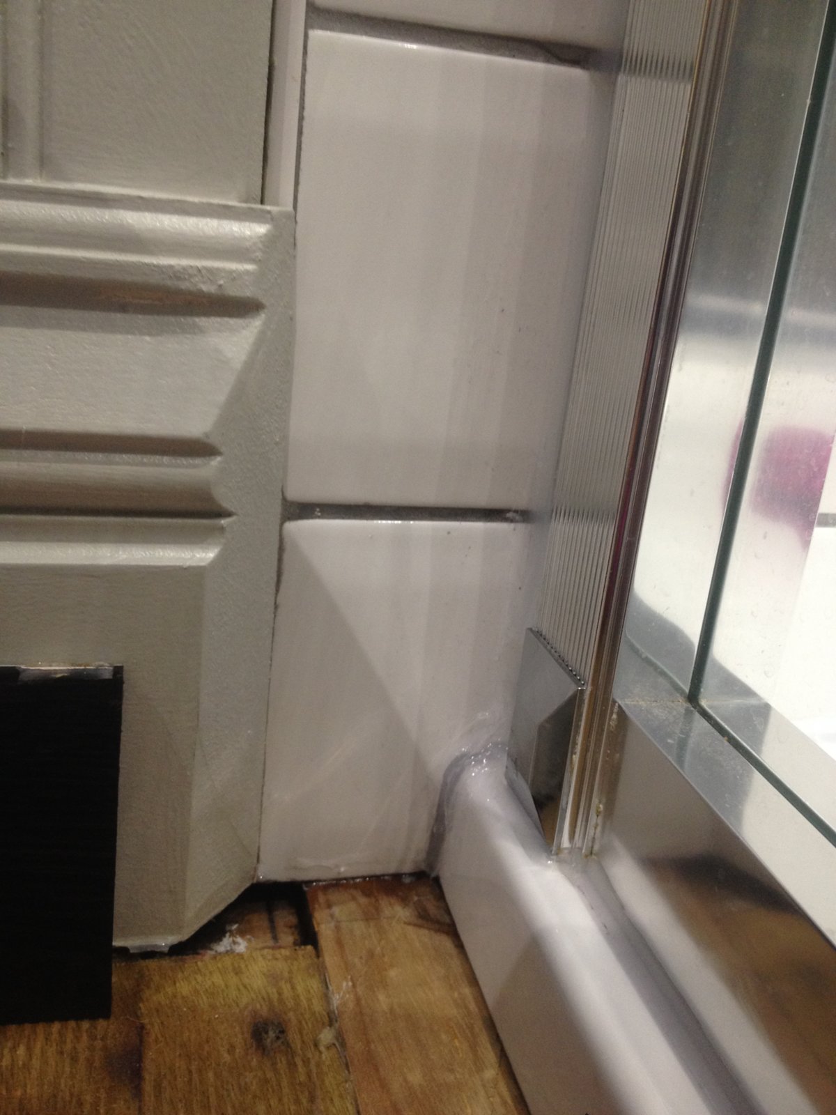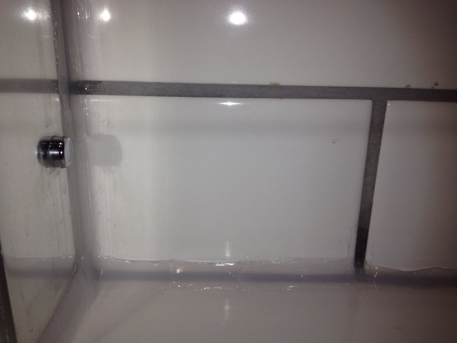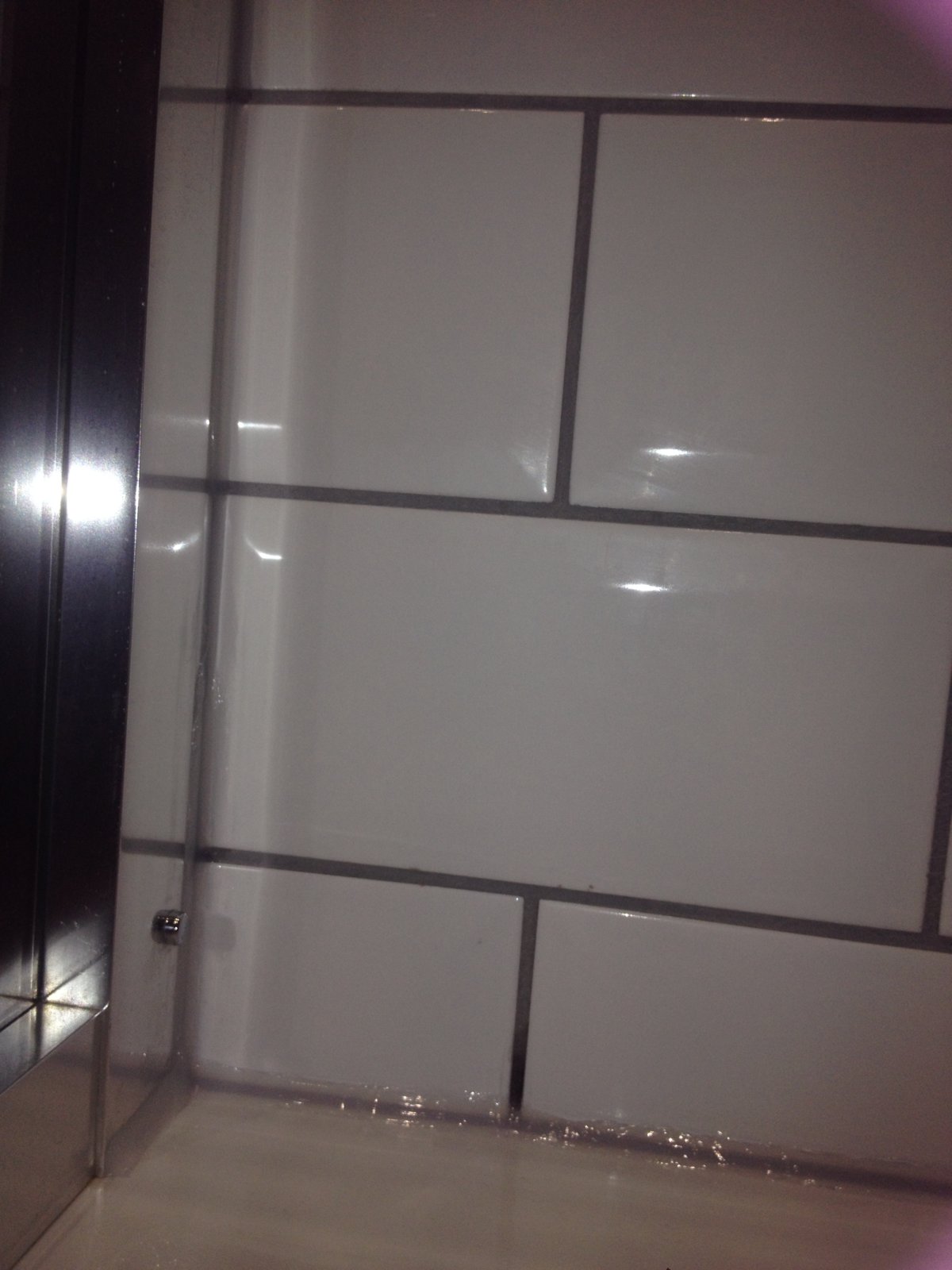 Short time later water is seeping up in-between the [Karndean] tiles, tracked this back to corner where one glass panel meets the wall. Dried out for >3 days using a hair dryer. Some grout appeared darker than the rest, but upon inspection of the sealant it appeared there was a small gap. Pouring a cup of water on the area meant more water leaking. (No water marks on the downstairs ceiling).