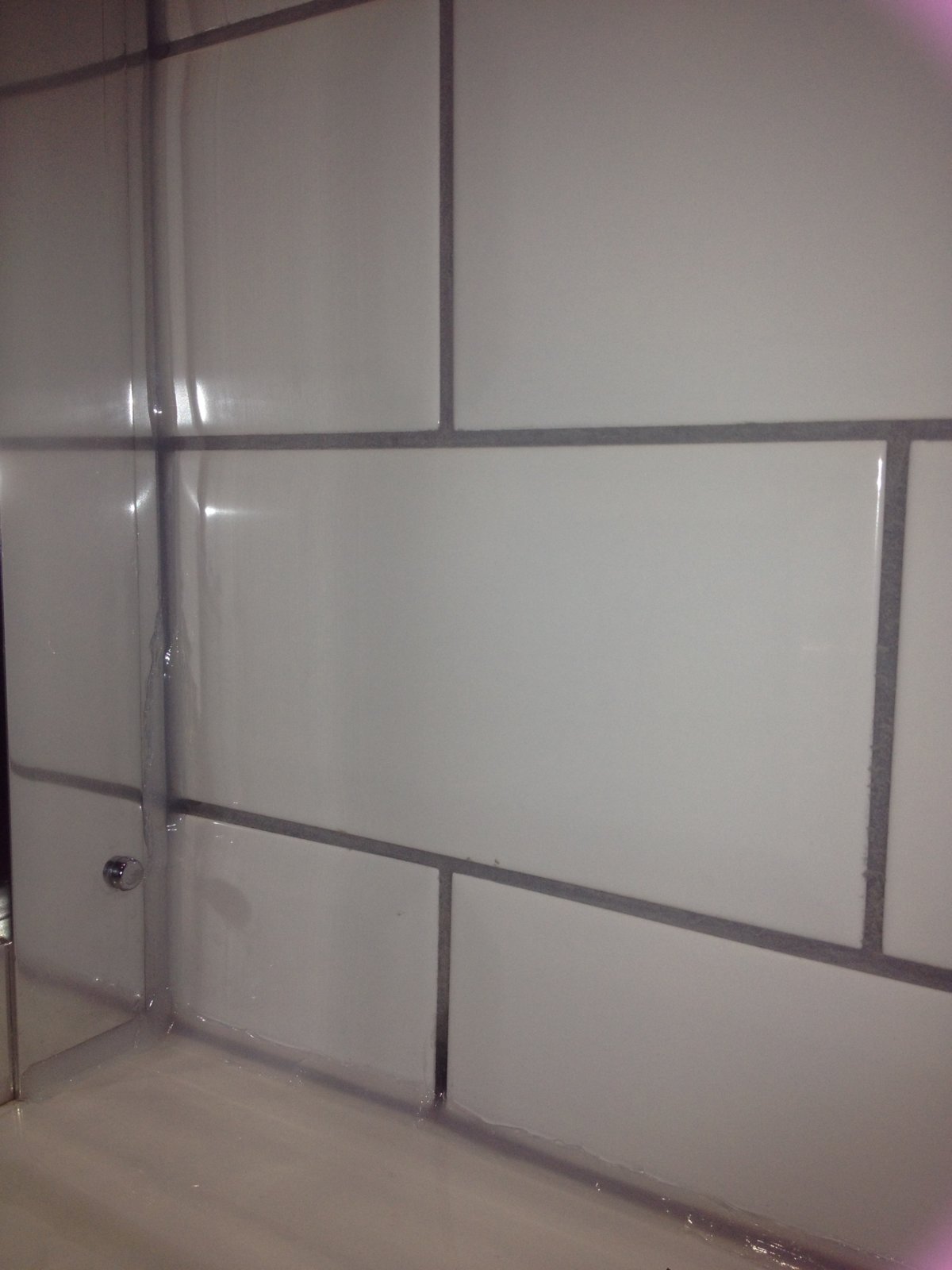 Left to dry >48 hours prior to sealing the grout. Left to dry for weeks because we were delayed fitting the rest of the shower. 2 glass panels fitted for the rest of the cubicle.