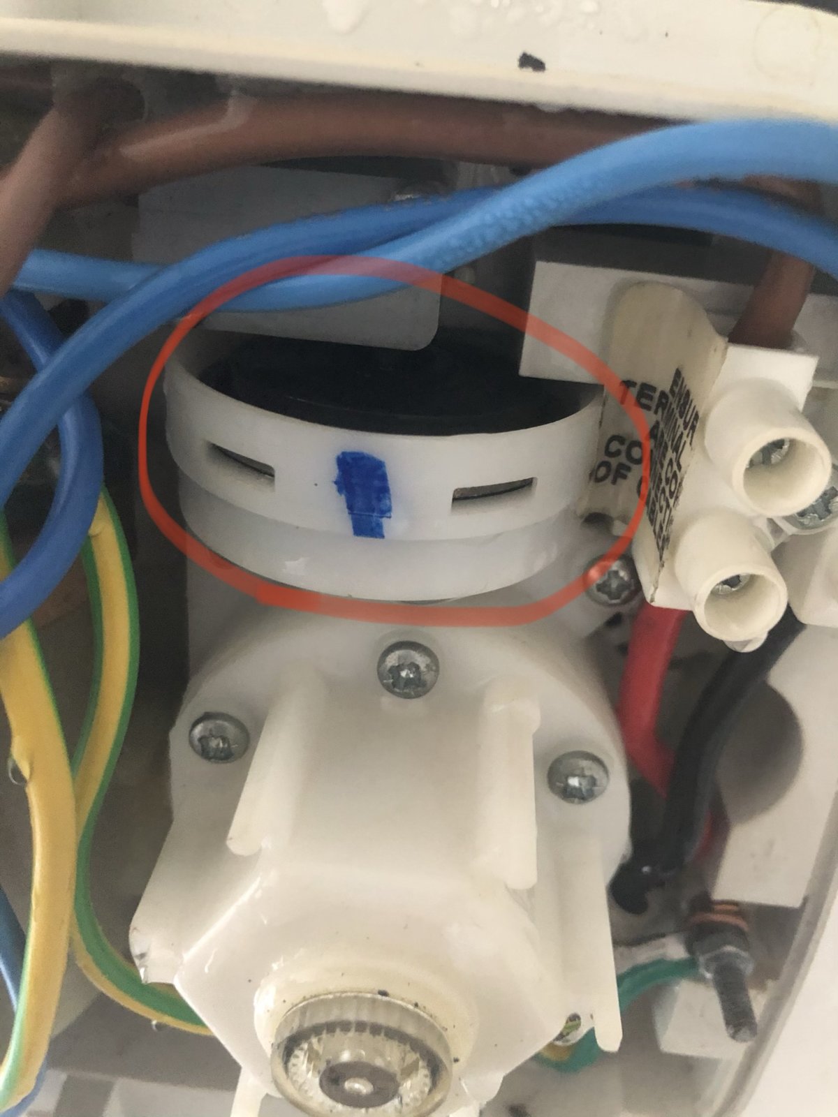 Hi my electric shower has stated leaking when I turn it on. I’ve took off the cover and the water is gushing out the circled spot on the picture every time the shower is on. Any help please? Thanks