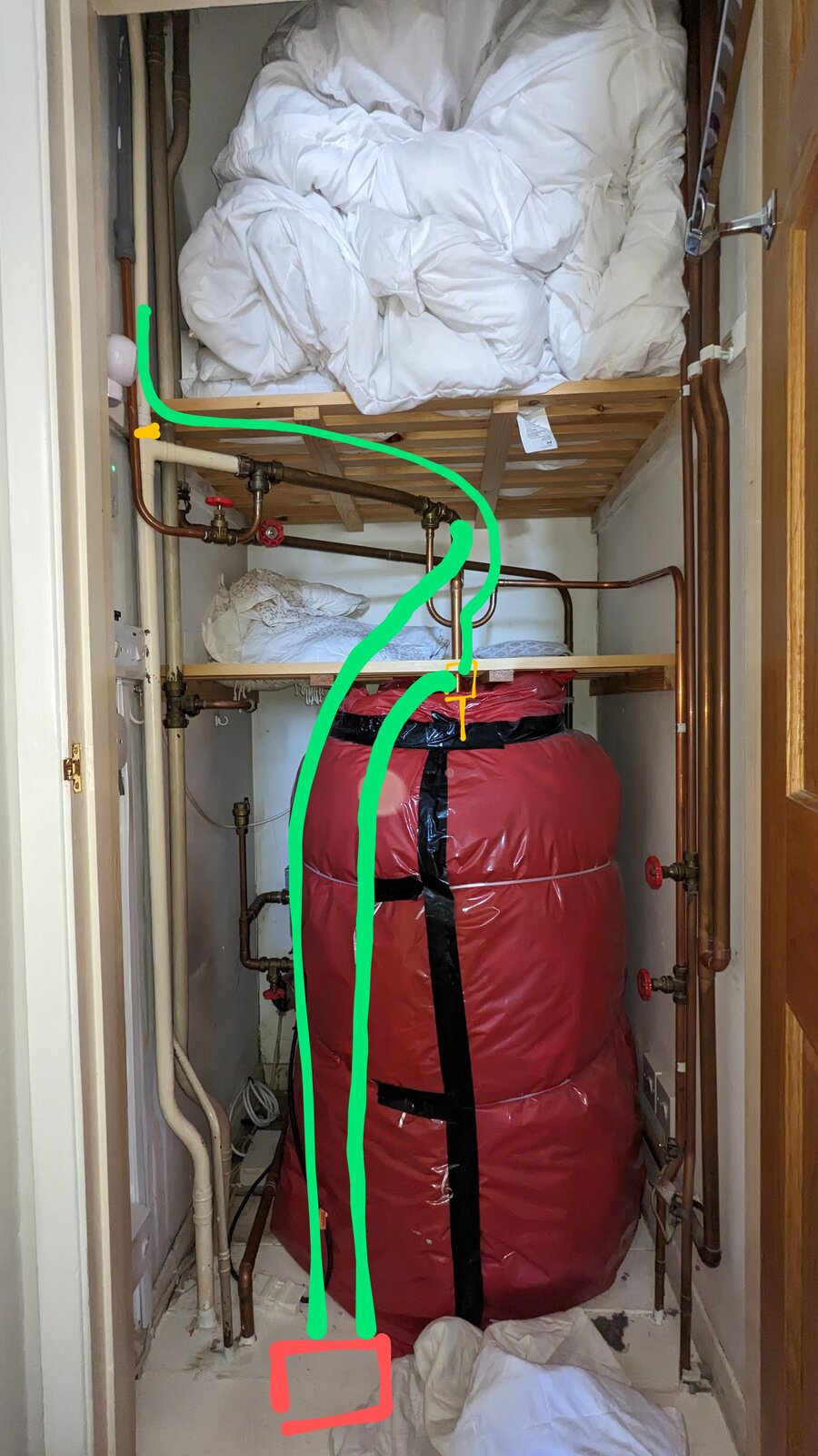 I have a dilemma. I have ordered a shower booster pump and the installation instructions state to install after the vent pipe but as you can see from the pic it looks as if the main hot water pipe from the top of the cylinder has been tee'd twice not including the tee with the vent pipe. I believe from looking it up that the tee's are correct in being installed before the vent but I'm not sure how to proceed with installing the booster pumps (https://showerpowerbooster.co.uk/)