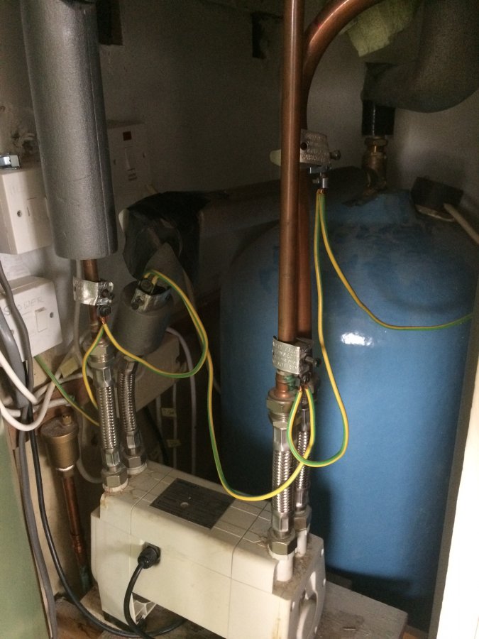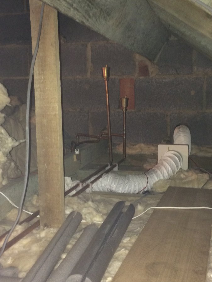 The pipework is pretty simple. Cold feed to the pump is down from the tank in the loft above. Hot feed to the pump is out the top of cylinder (behind pump) via a flange. Out of the pump to the shower is up into the loft, dropping down into the bathroom. With bottle vents at the top of the drop (raised above the cold tank level