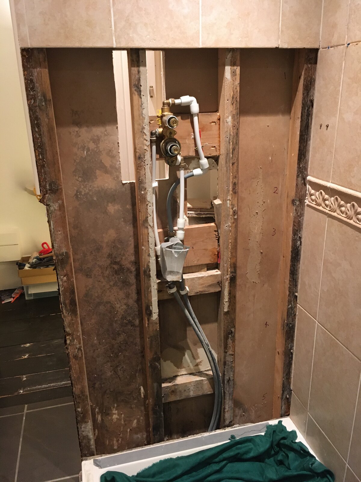 I’ve recently discovered that my shower valve has had a leak over many years. It is located in a stud wall. We have cured the leak. I have removed tiles and pulled the rotten damp plasterboard out, which appears to be the normal type. The plan is to cover the void with aquapanel (or such like) and re-tile etc. My reason for posting is all about the wood battens. They have suffered quite a bit but not to the point where I need to completely replace them (which would involve tearing the whole stud wall down and starting over). So i want to dry them out and use something on them. What is the best way to dry them out? 1. Fresh air with window open? 2. Mini heater fan? 3. Dehumidifier? 4. Combo? 5. Something else?
